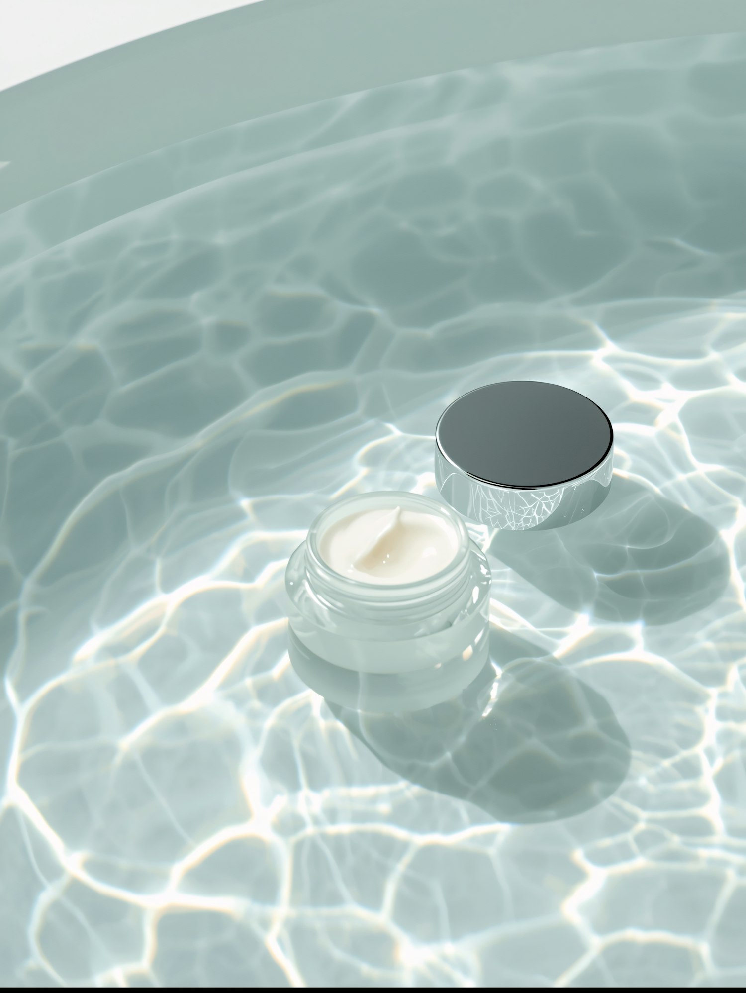 A sleek jar of cream floating in clear water, with sunlight creating rippling patterns, evoking a sense of luxury and freshness.