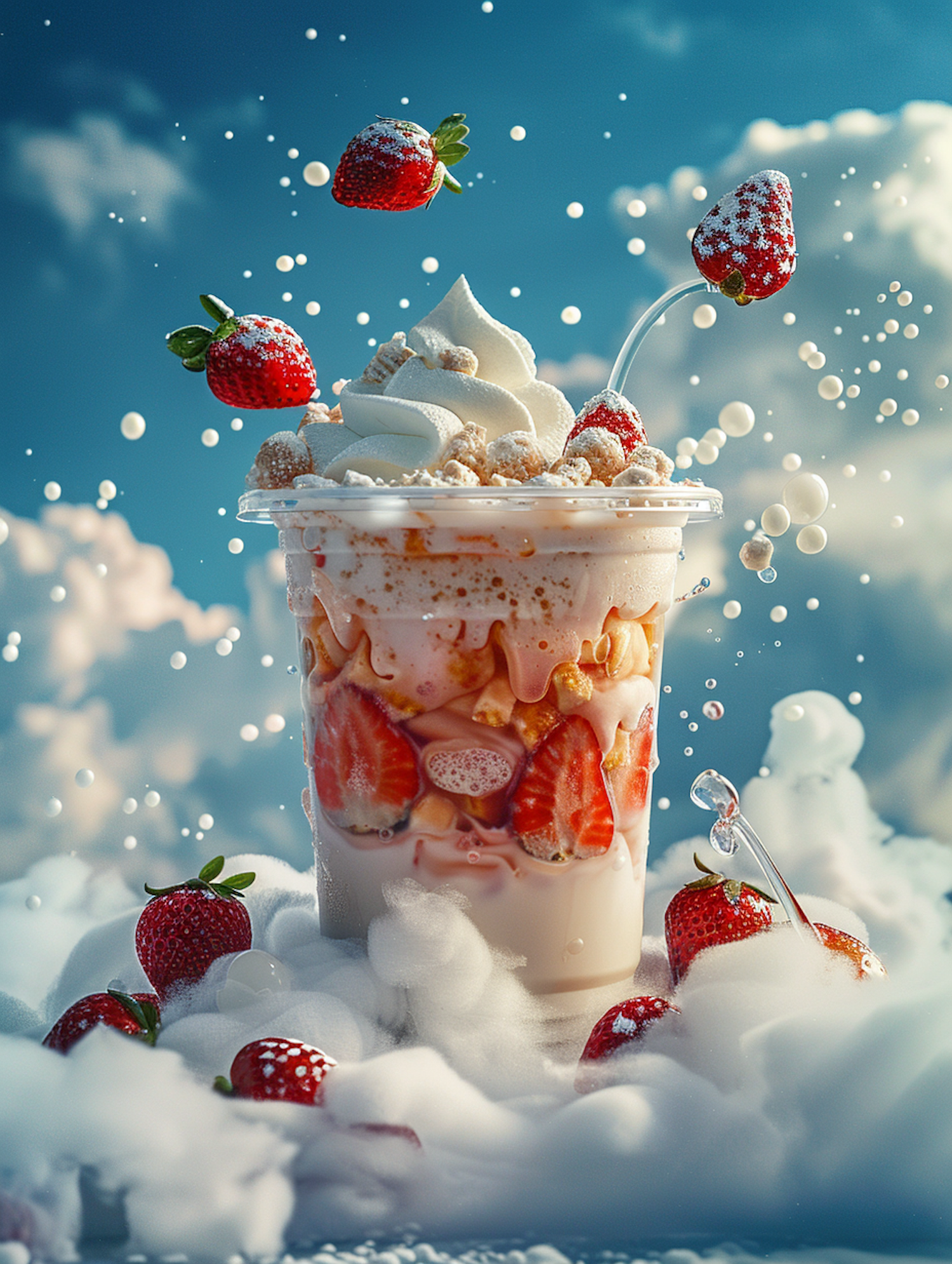 Dreamy dessert cup with strawberries, cream, and clouds, creating a whimsical and ethereal scene.