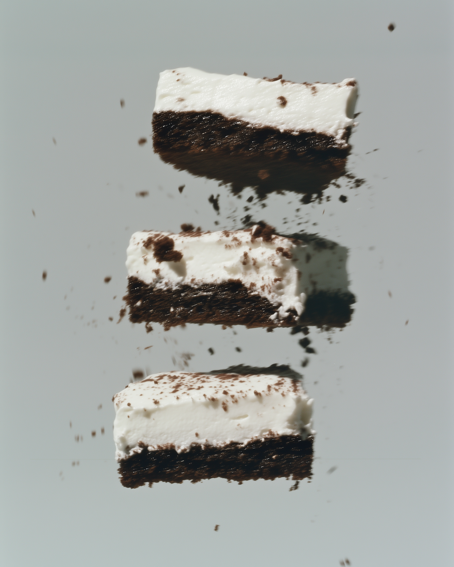 Three chocolate and cream dessert slices floating mid-air with scattered chocolate shavings, creating a playful and modern vibe.