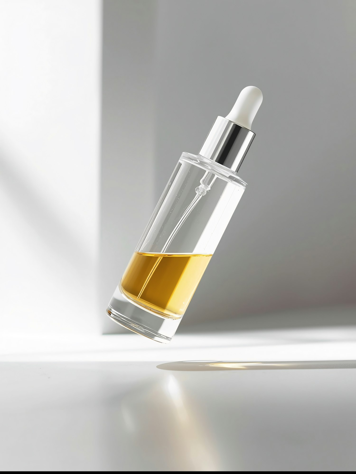 Minimalist shot of a glass dropper bottle with golden liquid, suspended mid-air against a clean white and gray background.