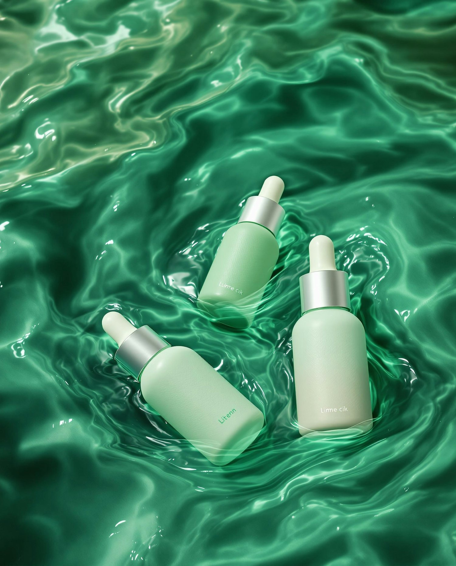 Elegant green dropper bottles floating on a rippling green liquid, showcasing a luxurious and refreshing skincare aesthetic.
