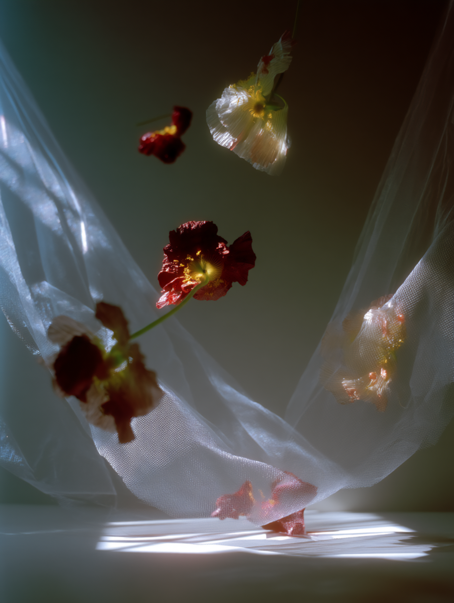 Floating red and white flowers with sheer fabric and soft lighting create a dreamy, ethereal composition with glowing petals.
