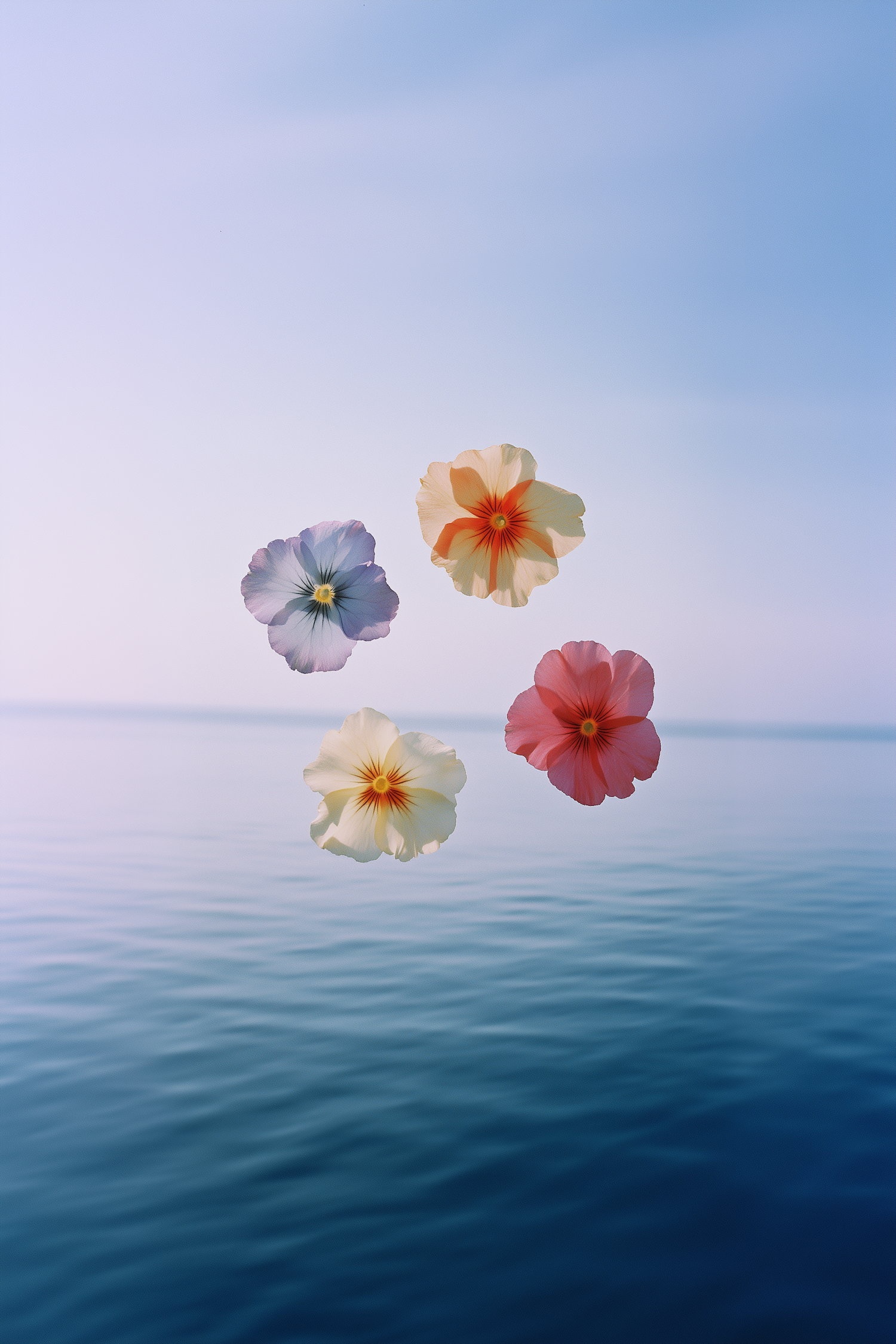Four colorful flowers float against a serene ocean backdrop, creating a dreamy and surreal visual with soft hues and calm vibes.