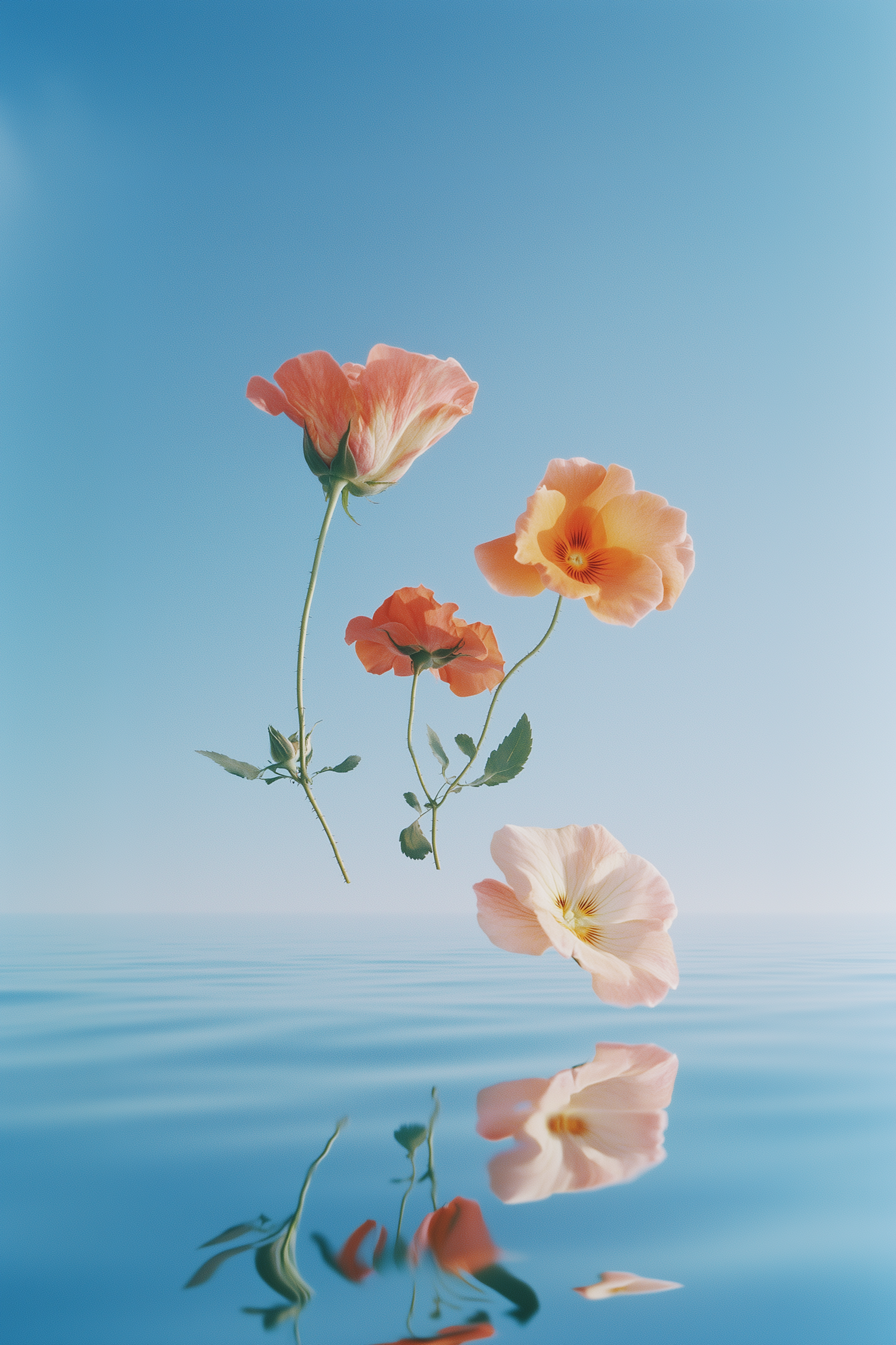 Floating orange and pink flowers reflected in calm water under a clear blue sky, creating a dreamy and serene atmosphere.