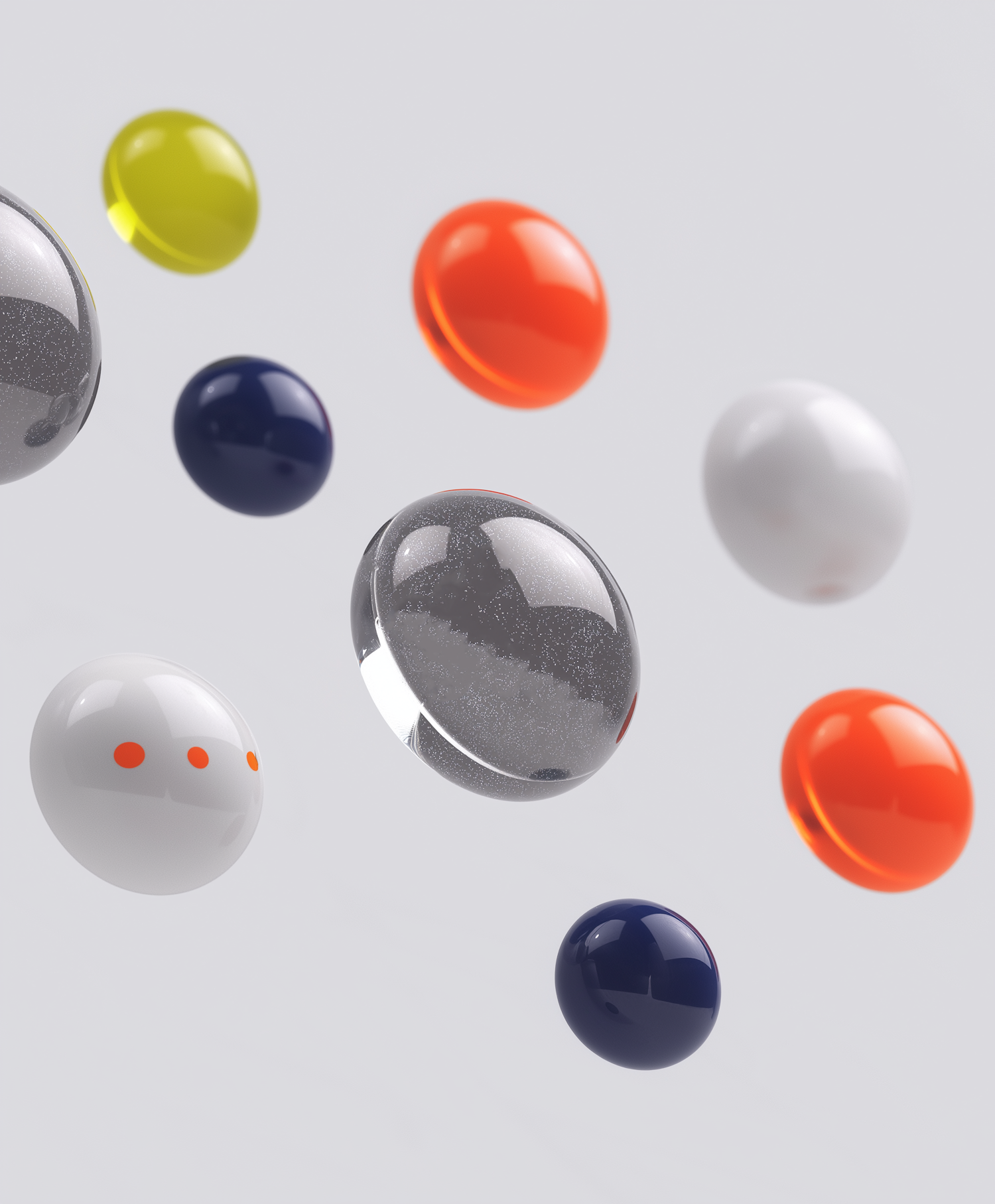 Floating glossy spheres and discs in vibrant colors like orange, navy, and yellow, with a glittery transparent sphere, on a light gray background.