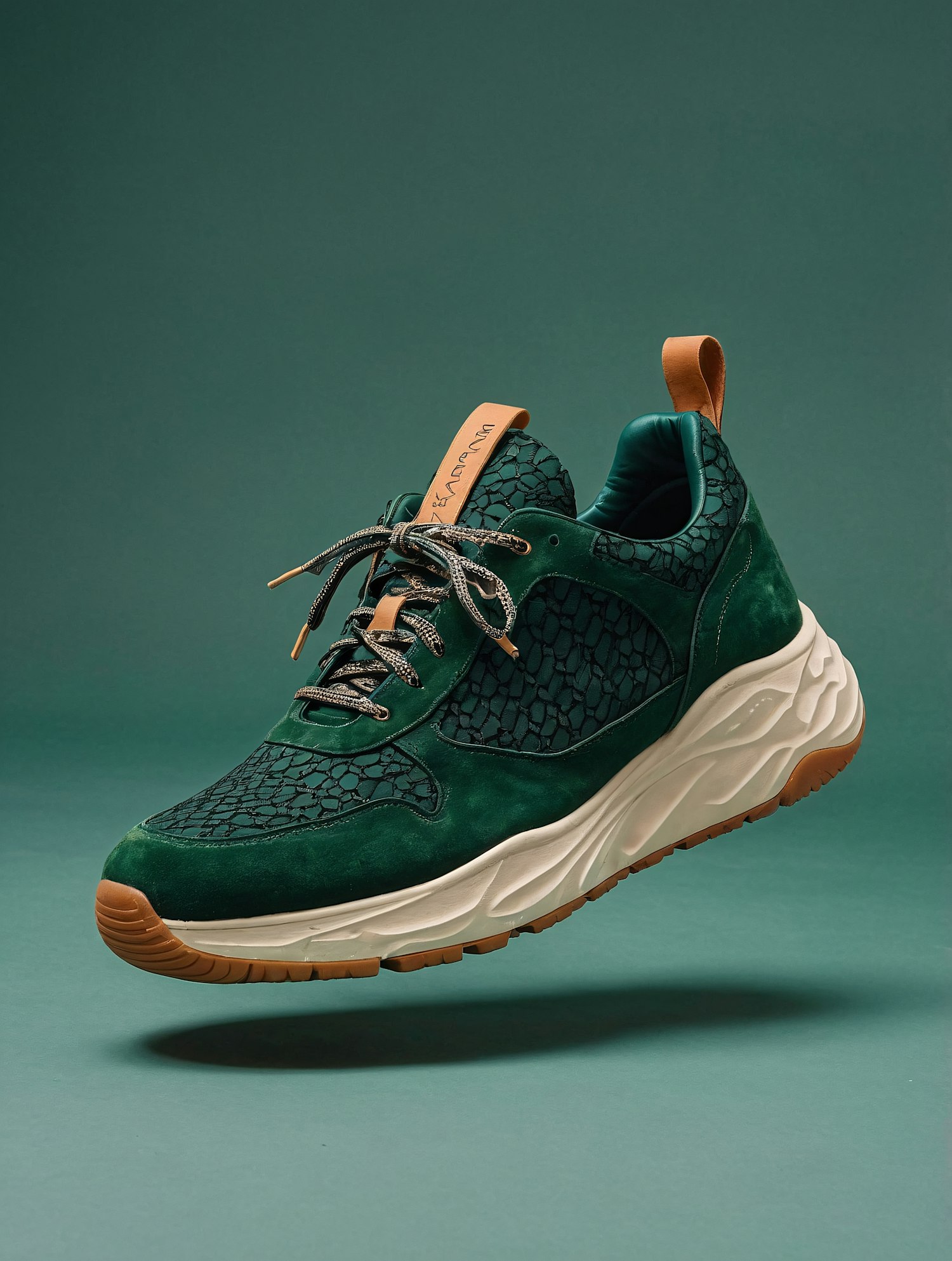 Green sneaker with textured pattern, gray laces, tan accents, and a thick white sole against a green background.