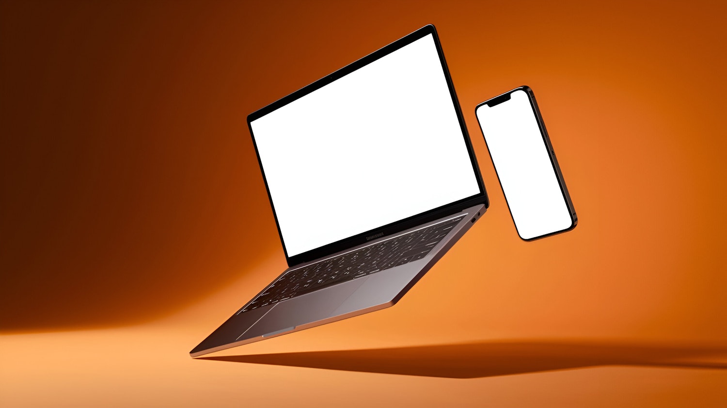 Floating laptop and smartphone with blank screens on an orange background, showcasing sleek design and modern tech aesthetics.