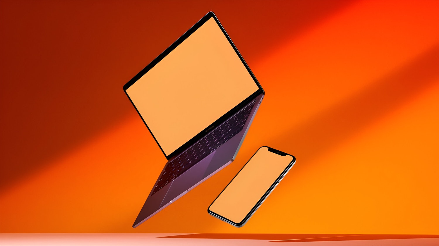 Floating laptop and smartphone with blank orange screens on a vibrant orange background, creating a modern and minimalistic tech vibe.