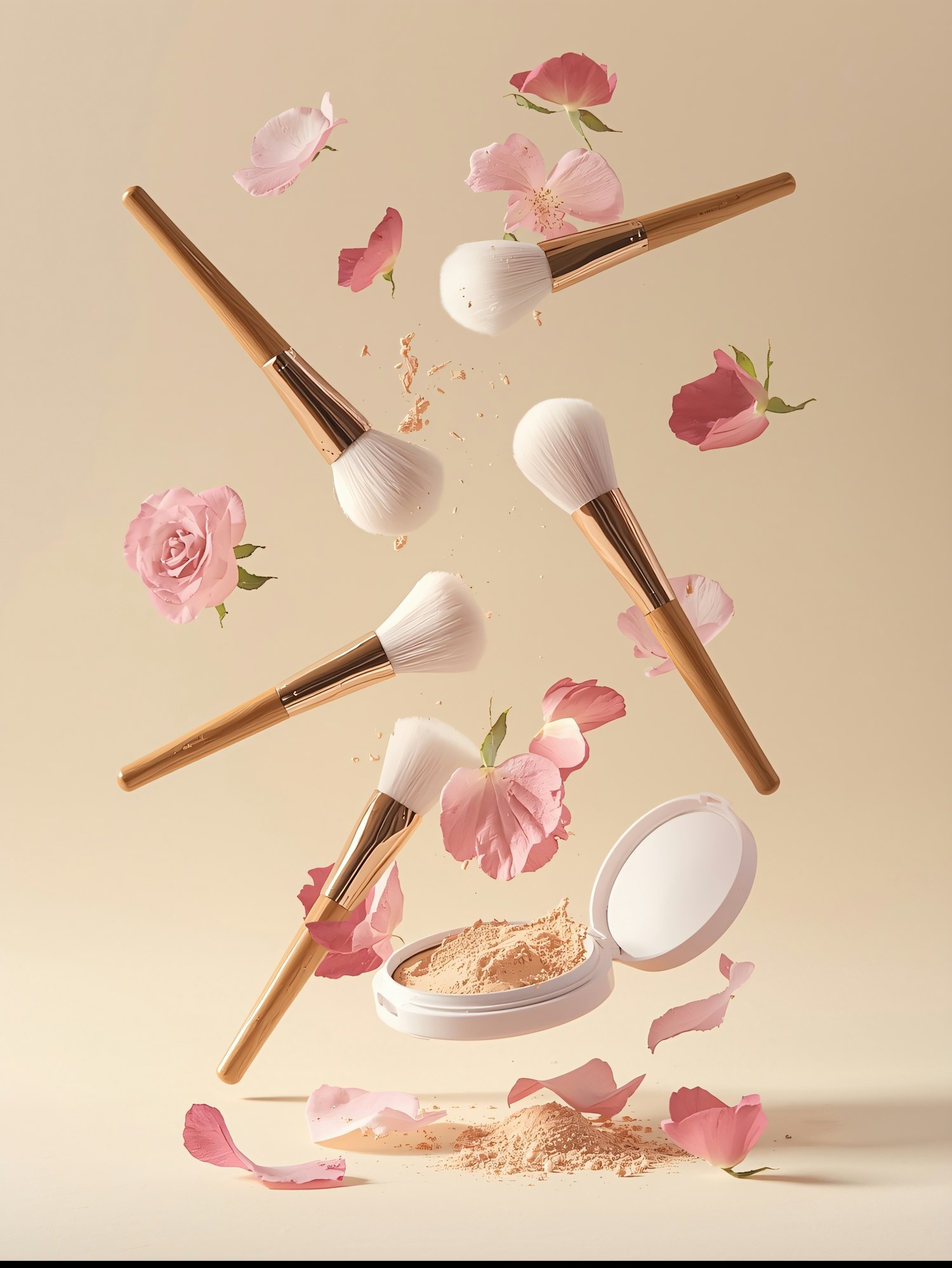 Floating makeup brushes, rose petals, and a compact powder create a dreamy, elegant beauty-themed composition.