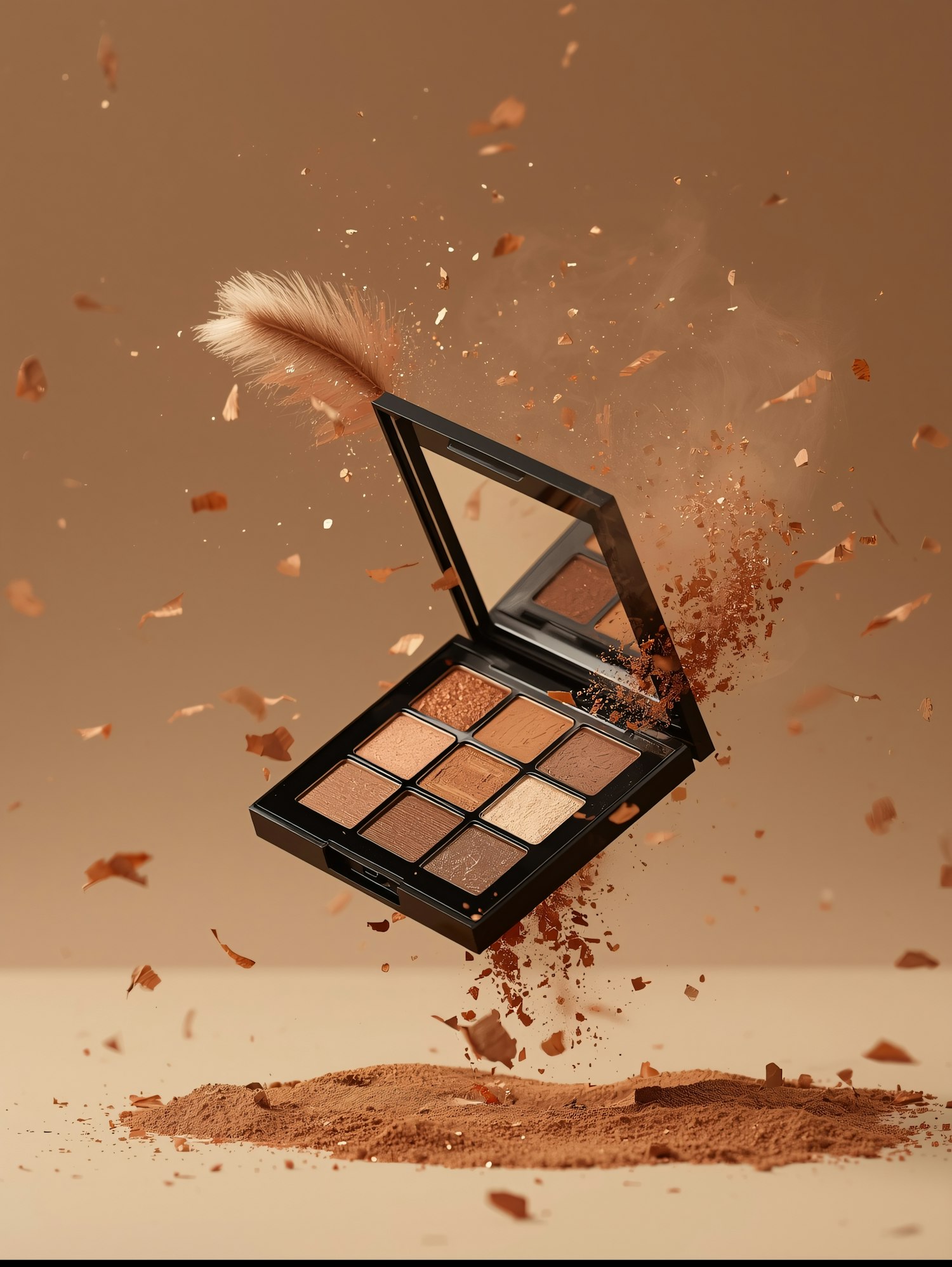 A dynamic shot of a makeup palette with earthy tones, featuring scattered powder and a soft feather, set against a warm beige background.