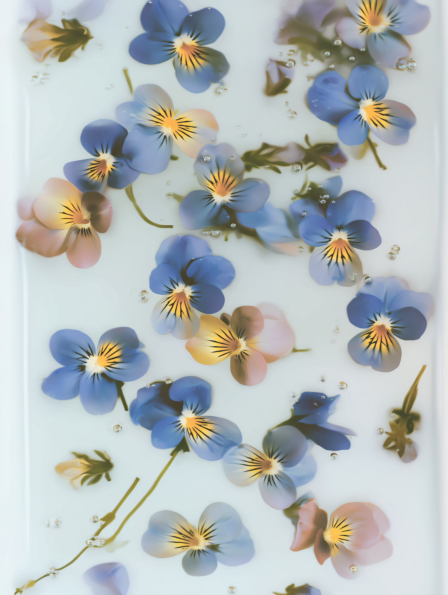 Delicate blue and yellow pansy flowers floating in a milky white liquid, creating a serene and artistic composition.
