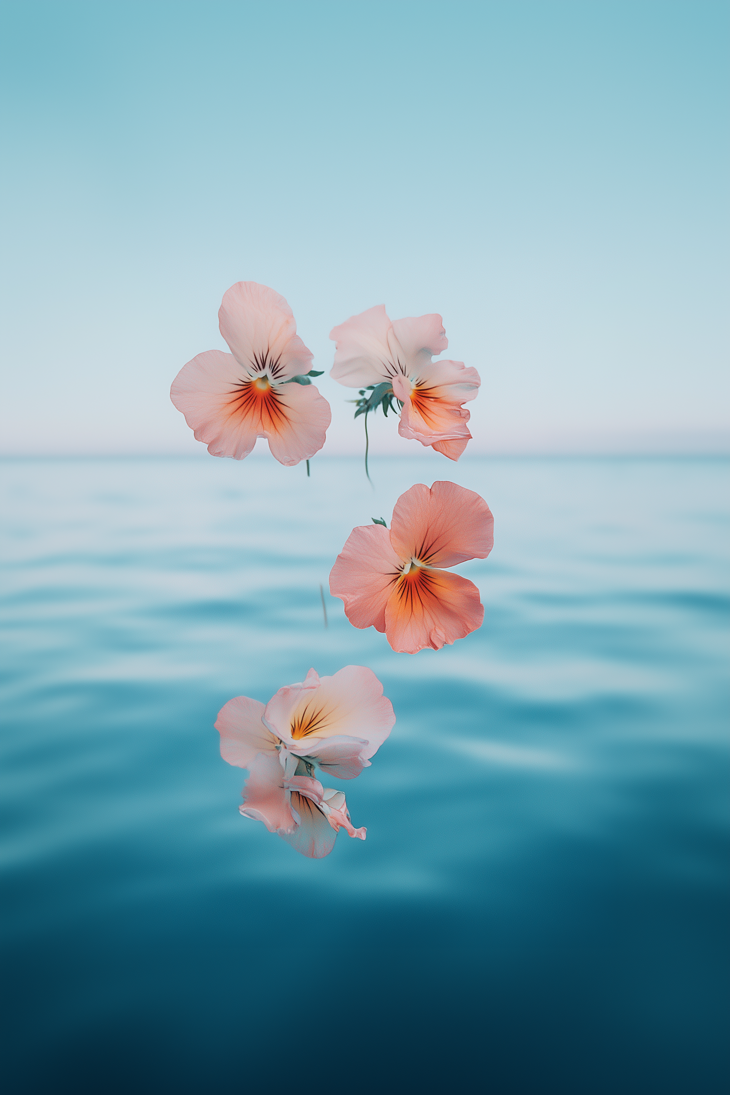 Floating pastel flowers with soft pink and peach hues against a serene blue ocean-like background, creating a dreamy, tranquil vibe.