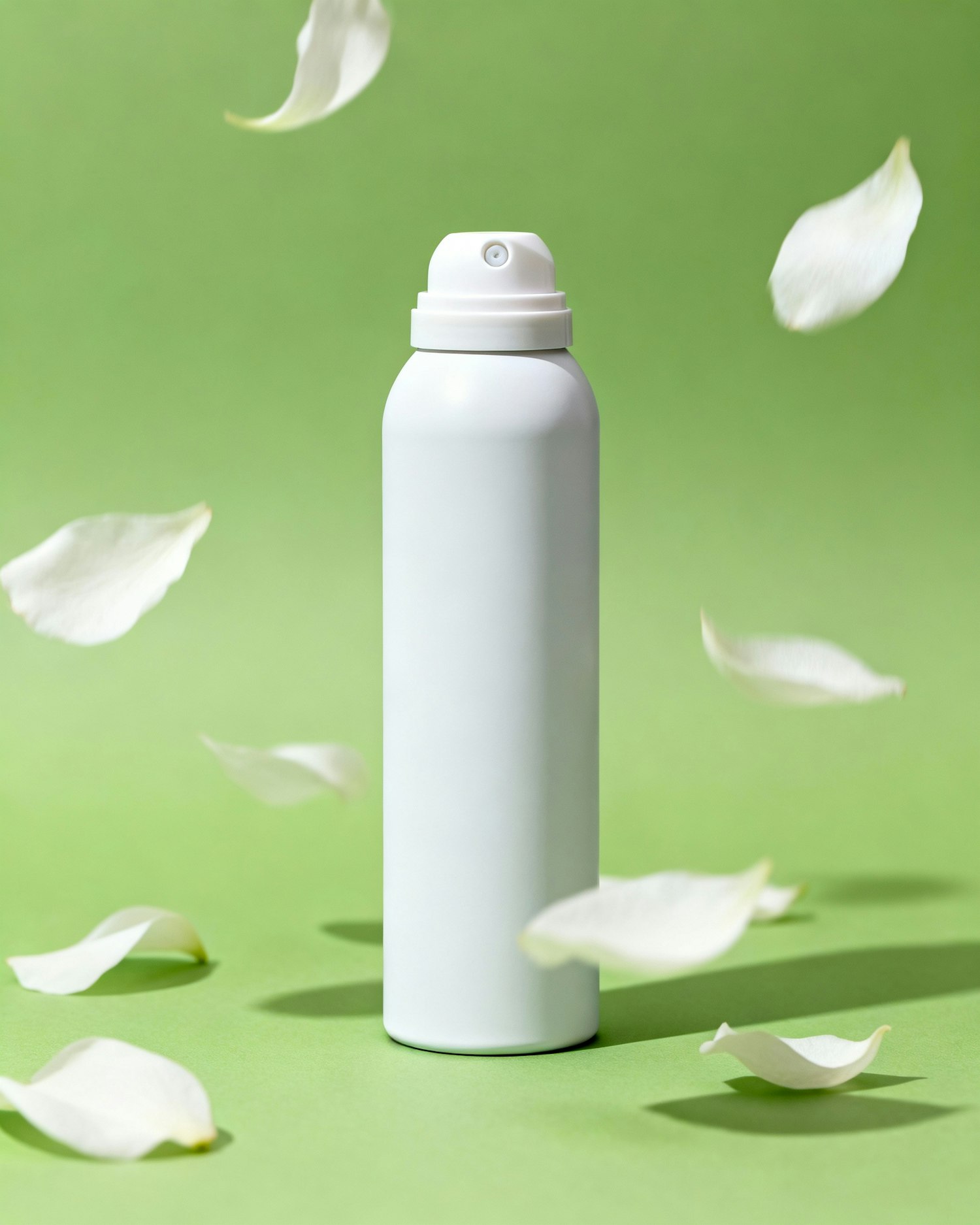 A white spray bottle surrounded by floating white petals on a green background, creating a fresh and minimalistic aesthetic.
