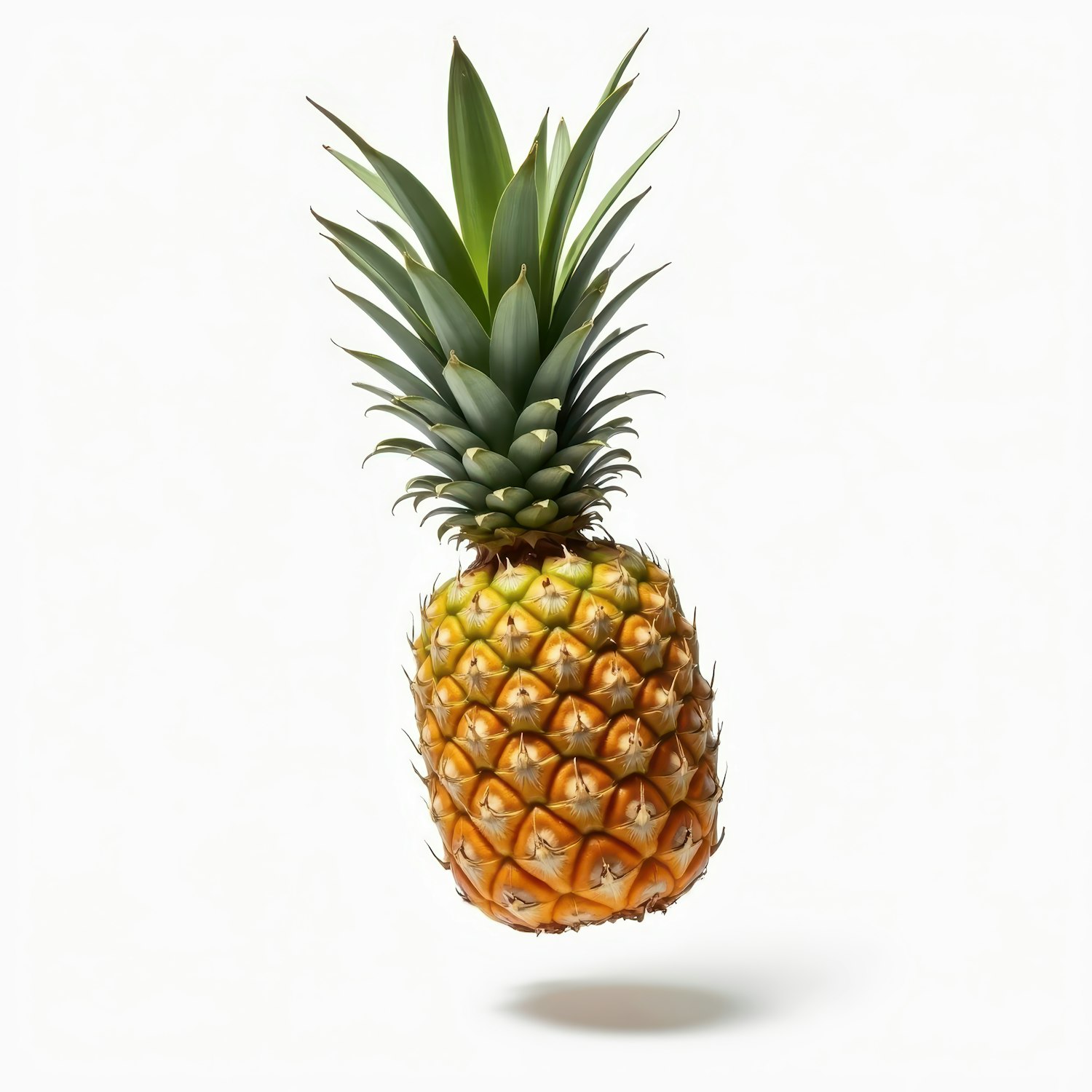 Vibrant pineapple with lush green crown against a white background, highlighting its golden skin and textured surface.