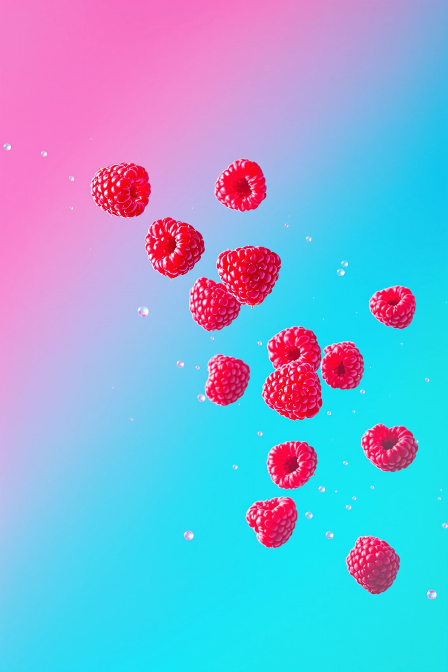 Vibrant red raspberries float against a pink-to-blue gradient background, creating a fresh and dynamic visual.