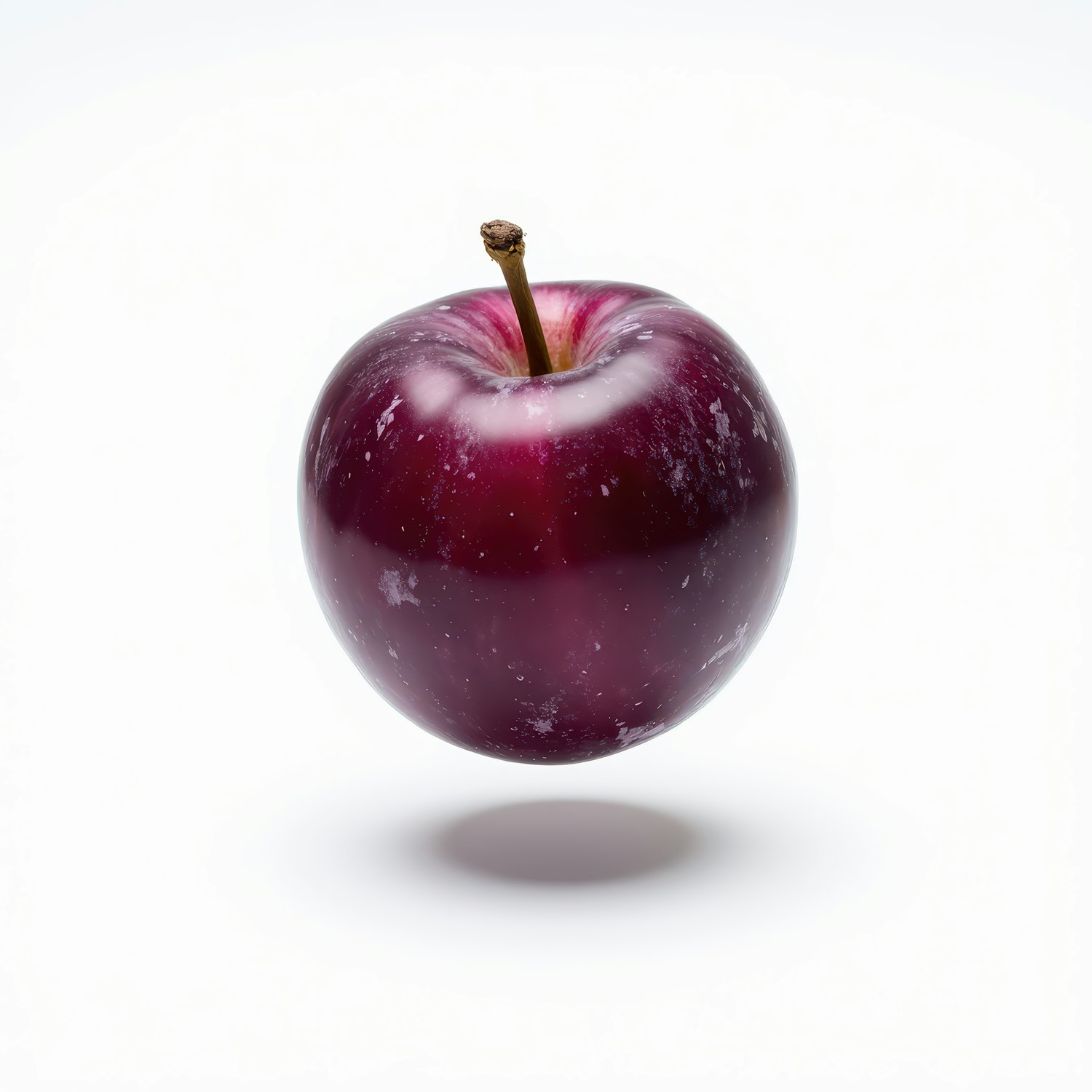 A glossy red apple with a maroon hue levitates against a white background, showcasing its smooth texture and natural imperfections.