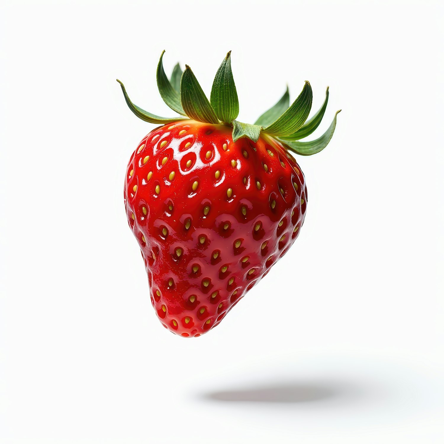 Floating ripe strawberry with glossy red skin and fresh green leaves on a white background, creating a minimalistic and vibrant look.