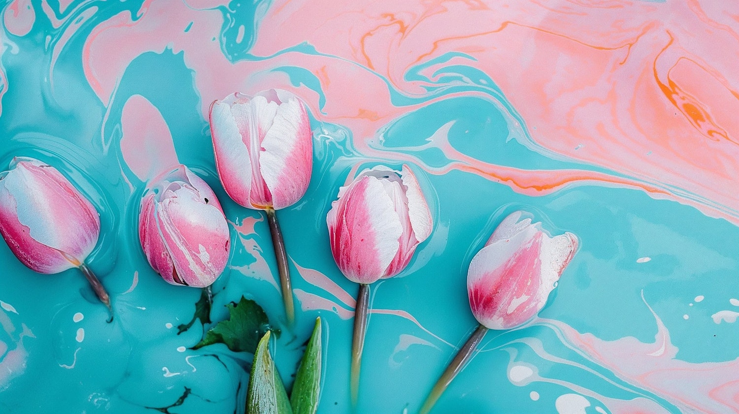 Floating pink tulips on a marbled turquoise and peach background create a serene and artistic floral composition.