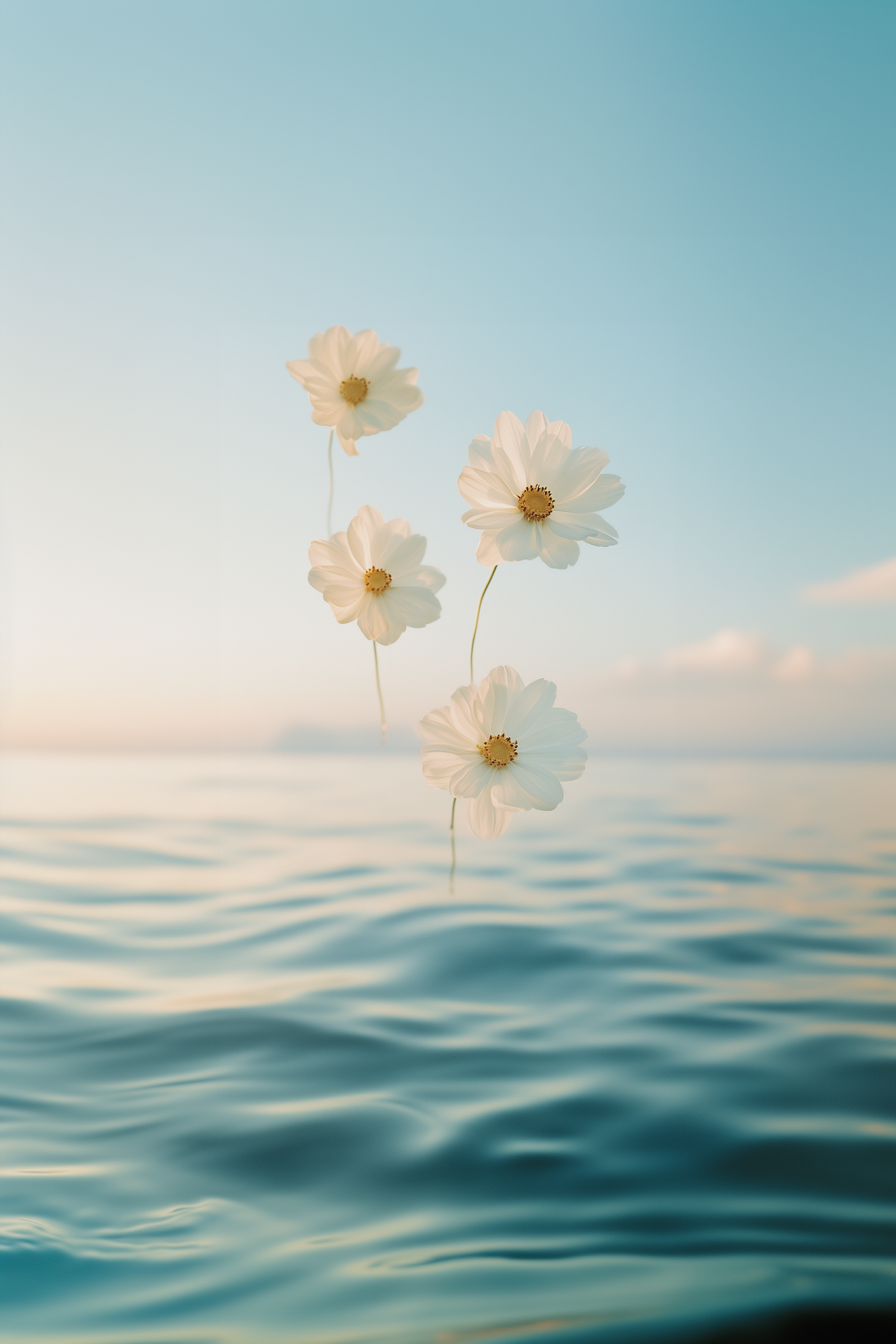 Four white flowers float above calm blue water under a pastel sky, creating a serene and dreamlike scene with soft, rippling reflections.