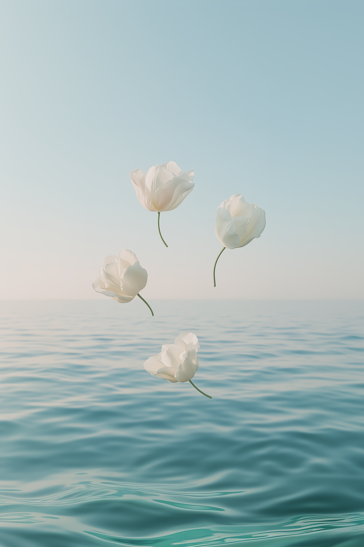 Four white tulips float above a calm turquoise ocean under a pale blue sky, creating a serene and dreamlike scene.