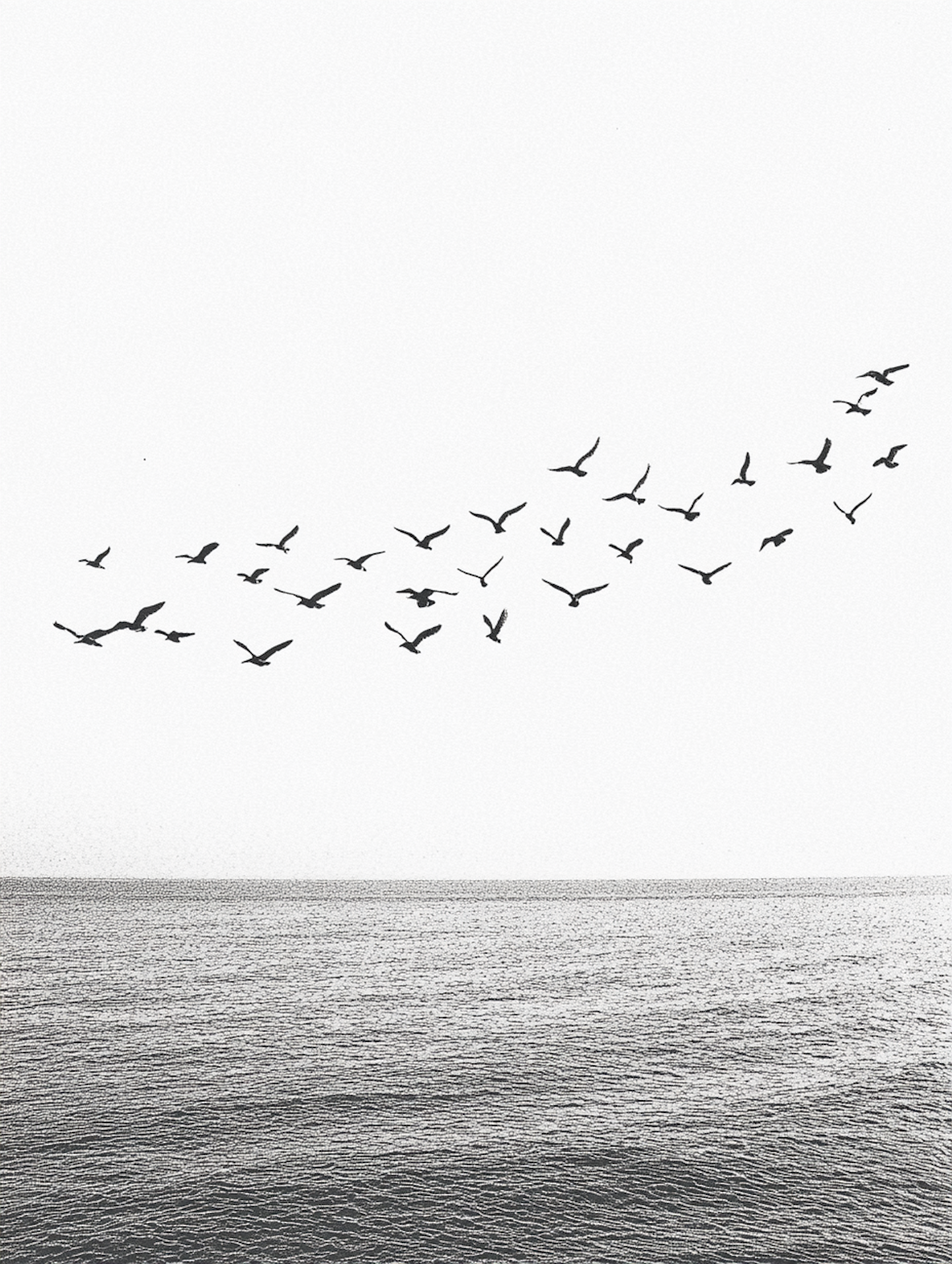 Minimalist black-and-white image of birds flying in formation over a calm ocean, with a stark white sky and textured water below.