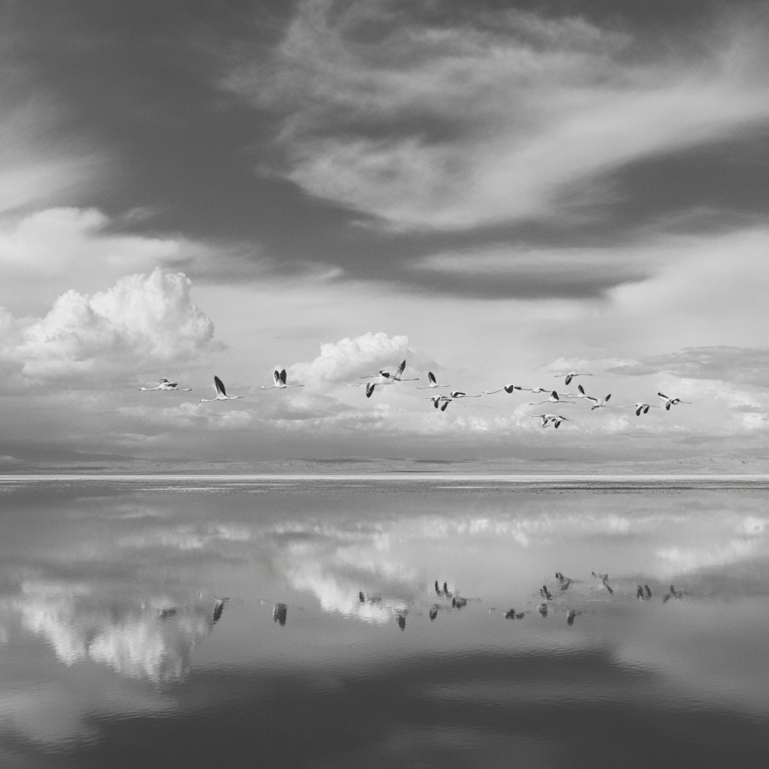 A black-and-white photo of birds flying over a reflective lake with dramatic clouds, creating a serene and symmetrical composition.