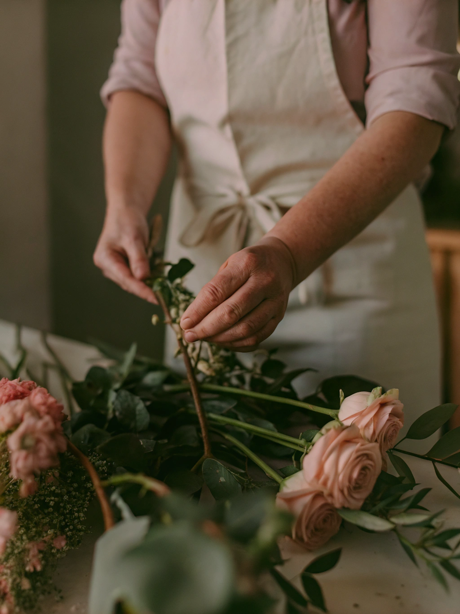 Hands arranging soft pink roses and greenery on a table, creating a serene floral arrangement in warm, natural lighting.
