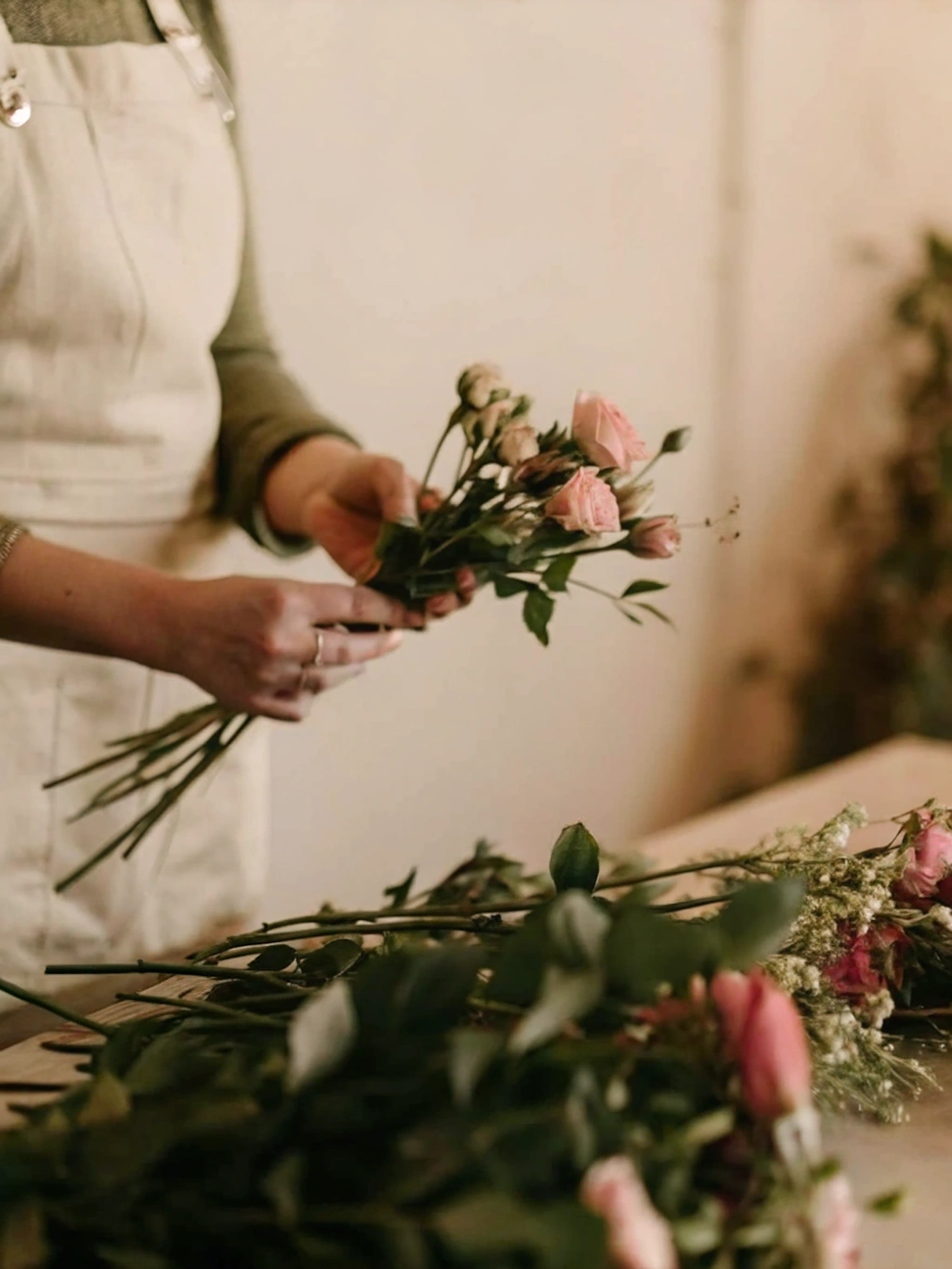 A florist arranges a bouquet of pink roses on a rustic table, surrounded by greenery and soft, warm lighting.