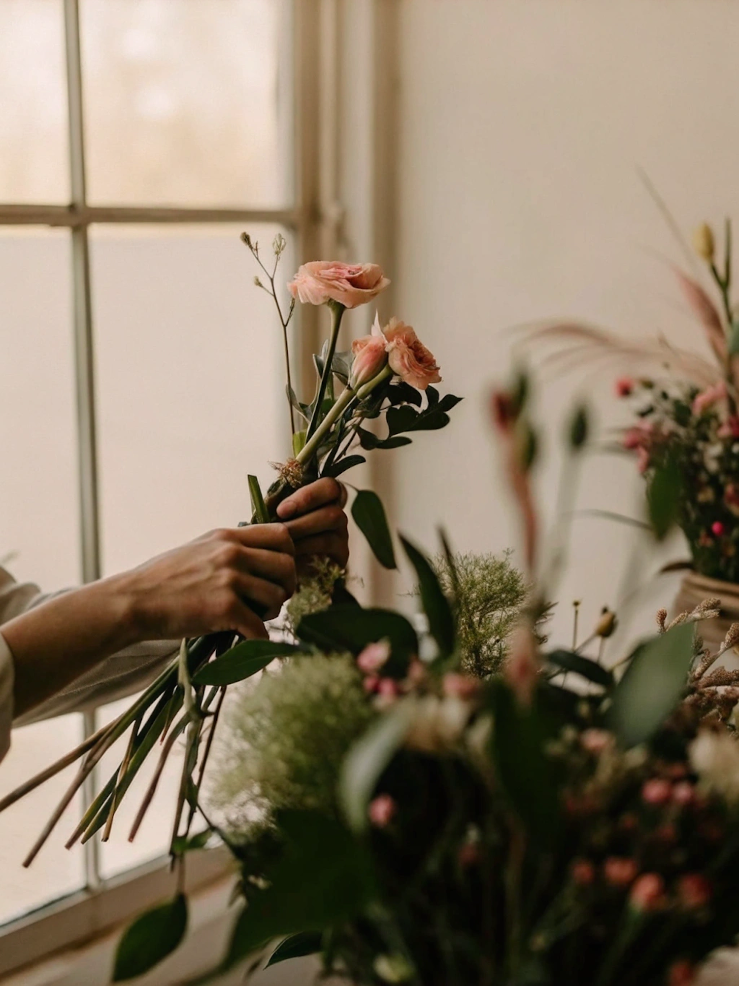 A person arranges a delicate bouquet of pink roses and greenery near a softly lit window, creating a serene and artistic floral scene.