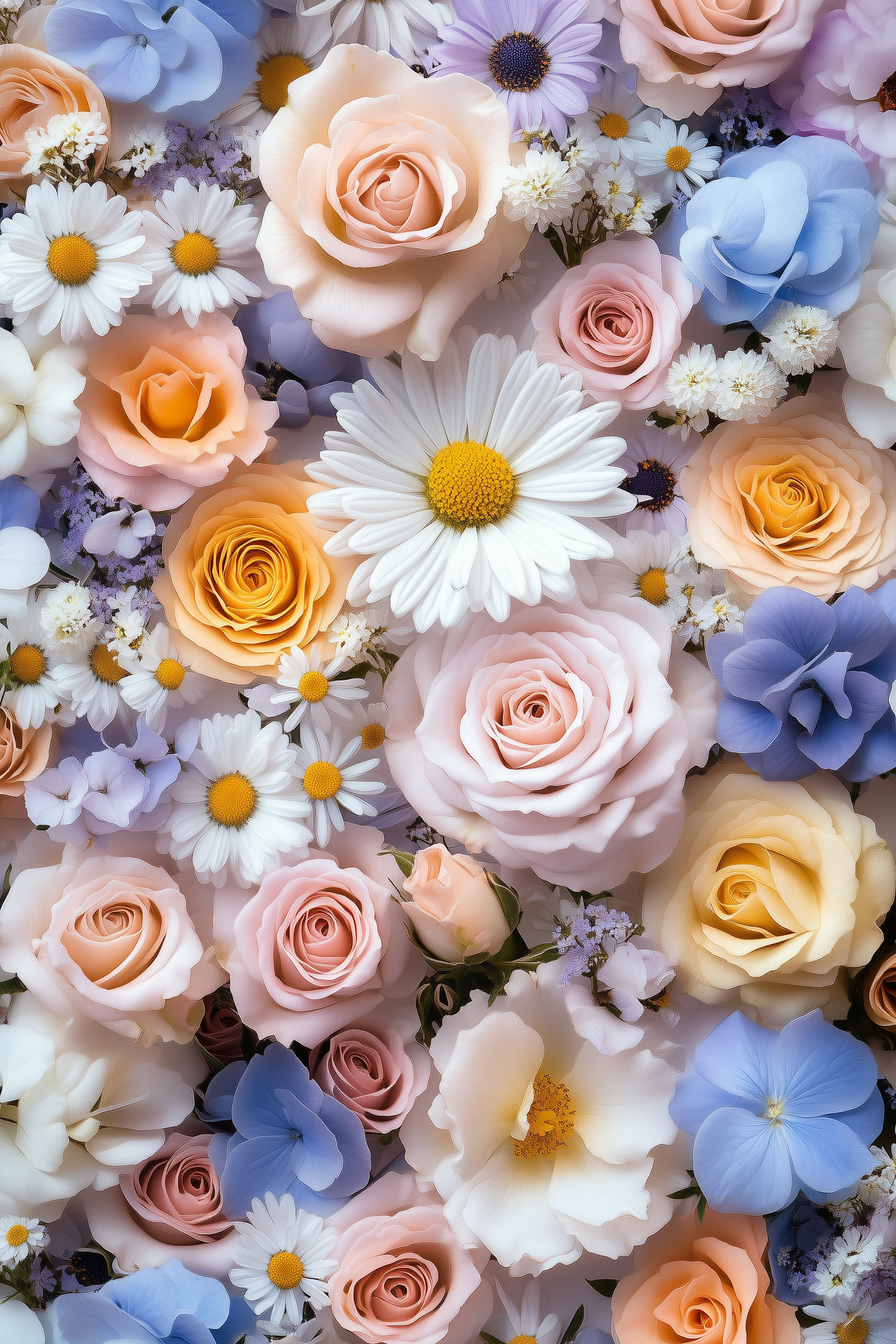 A lush floral arrangement with pastel roses, daisies, and hydrangeas, creating a harmonious blend of colors and textures.