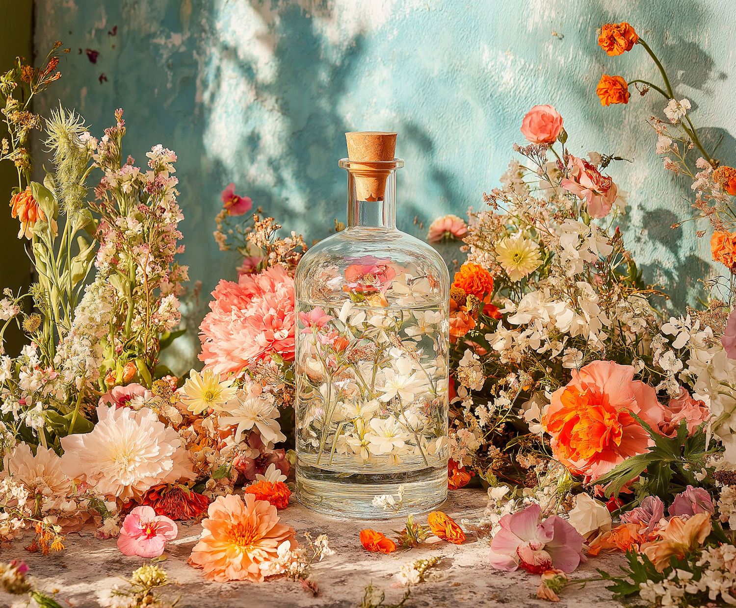 A glass bottle with flowers inside, surrounded by vibrant blooms against a rustic blue wall, bathed in warm sunlight.