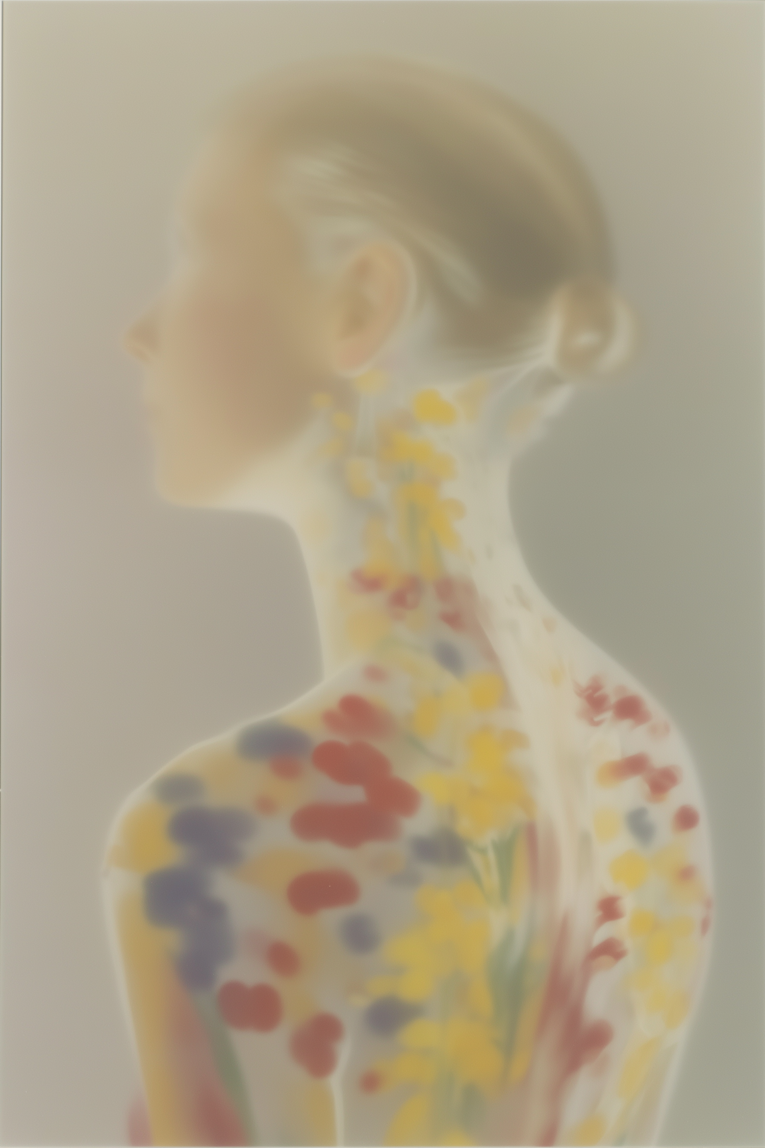 Dreamy portrait of a person with floral body art in soft focus, featuring vibrant yellow, red, and blue hues on a neutral background.