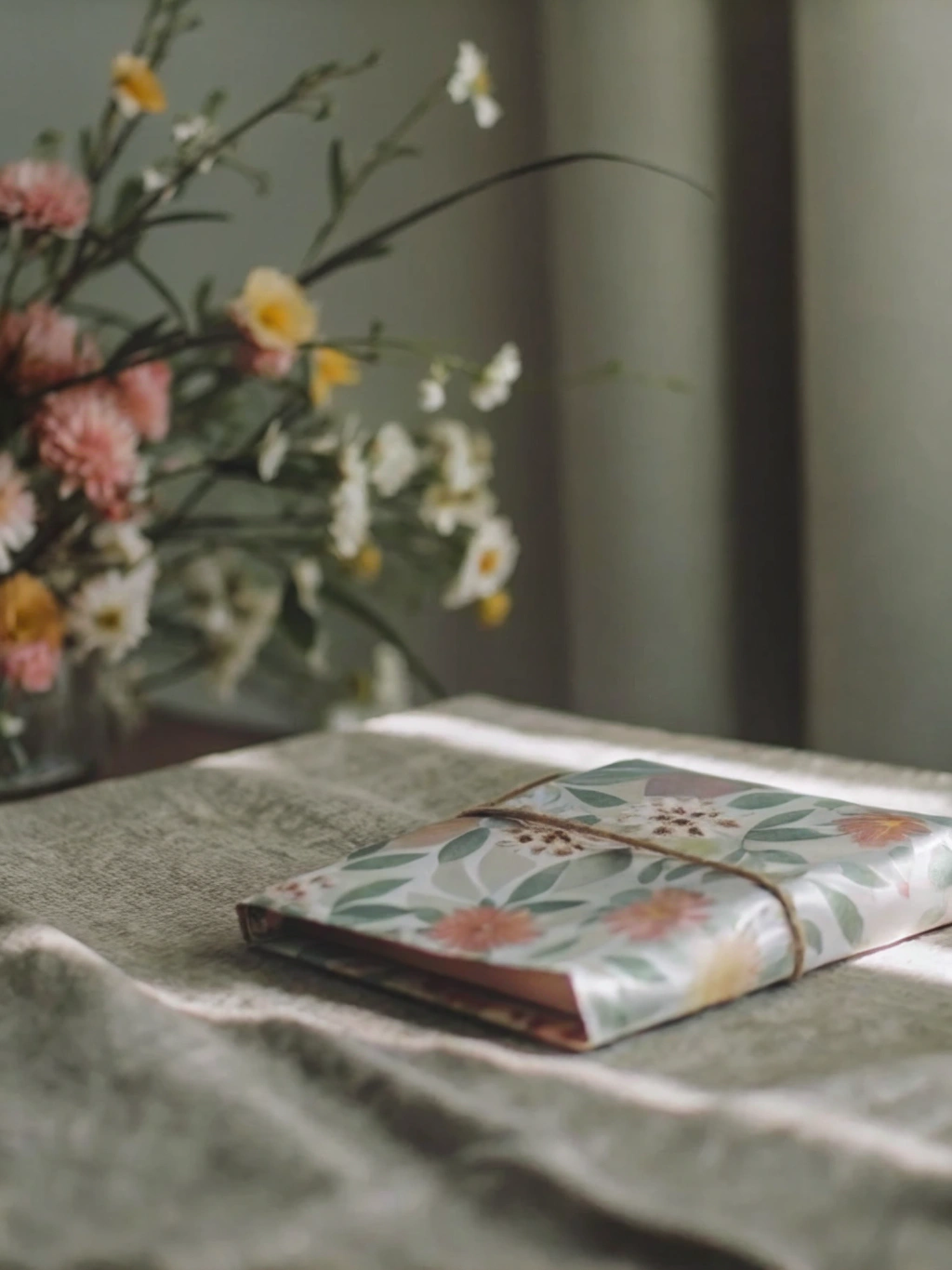 A floral-wrapped book tied with string rests on beige fabric, with a blurred bouquet of daisies and chrysanthemums in the background.
