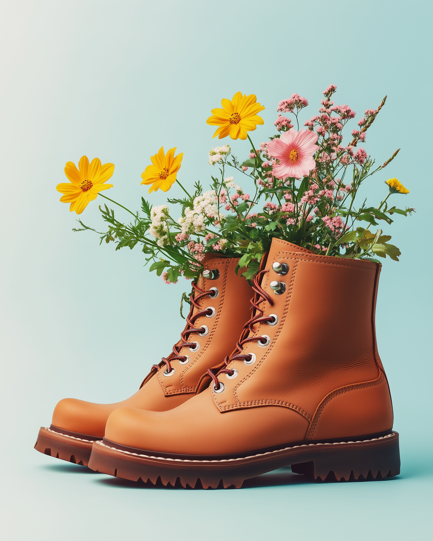 Tan leather boots used as planters with vibrant flowers against a pastel blue background, creating a whimsical and artistic scene.
