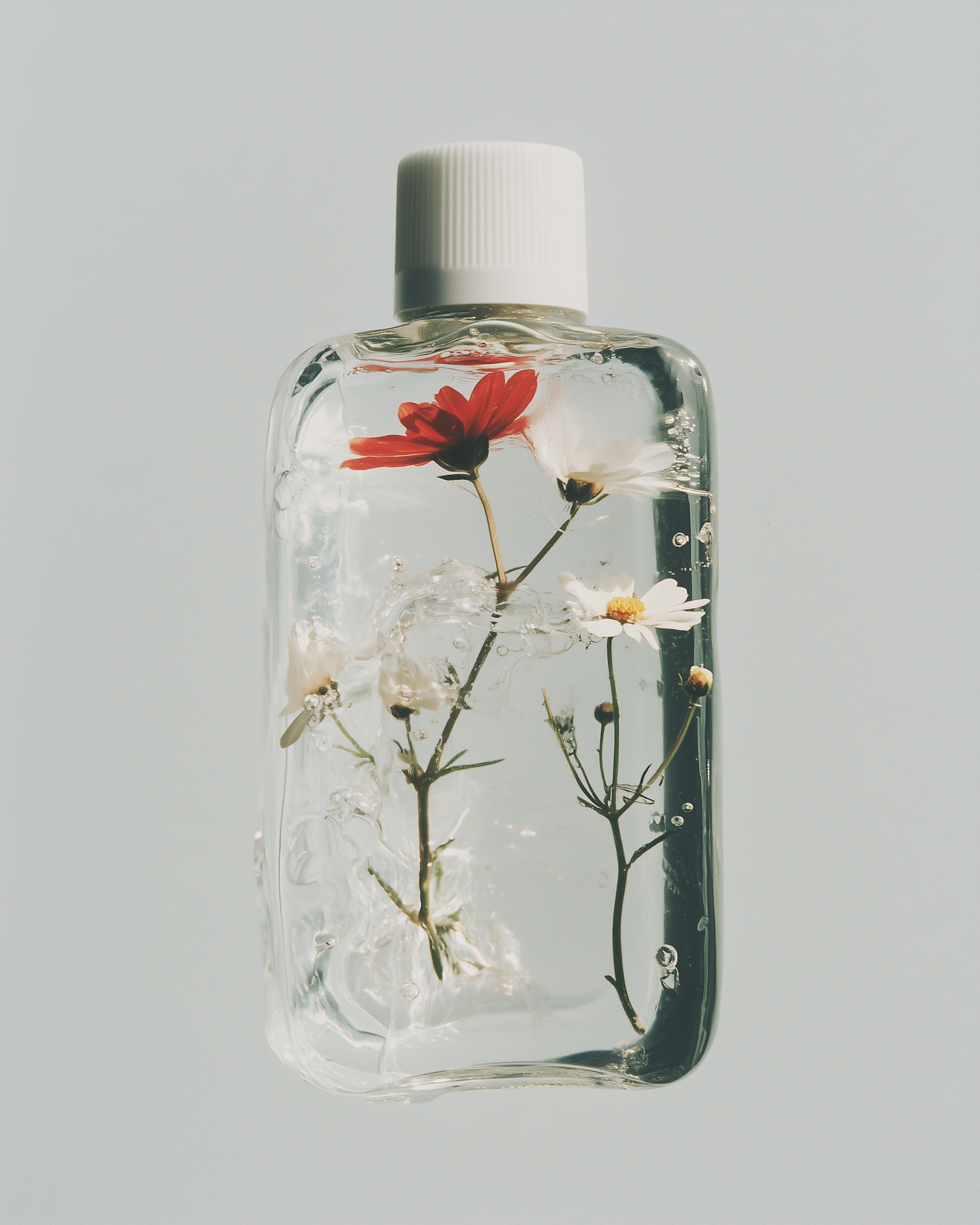 A clear bottle with red and white flowers suspended in liquid, set against a soft blue background for a minimalist aesthetic.
