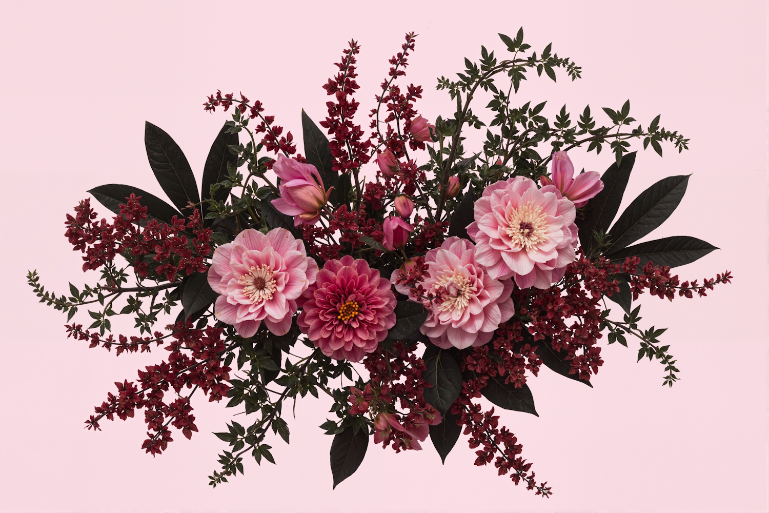 Elegant floral arrangement with pink dahlias and red flowers on a soft pink background, showcasing natural beauty and artistic design.