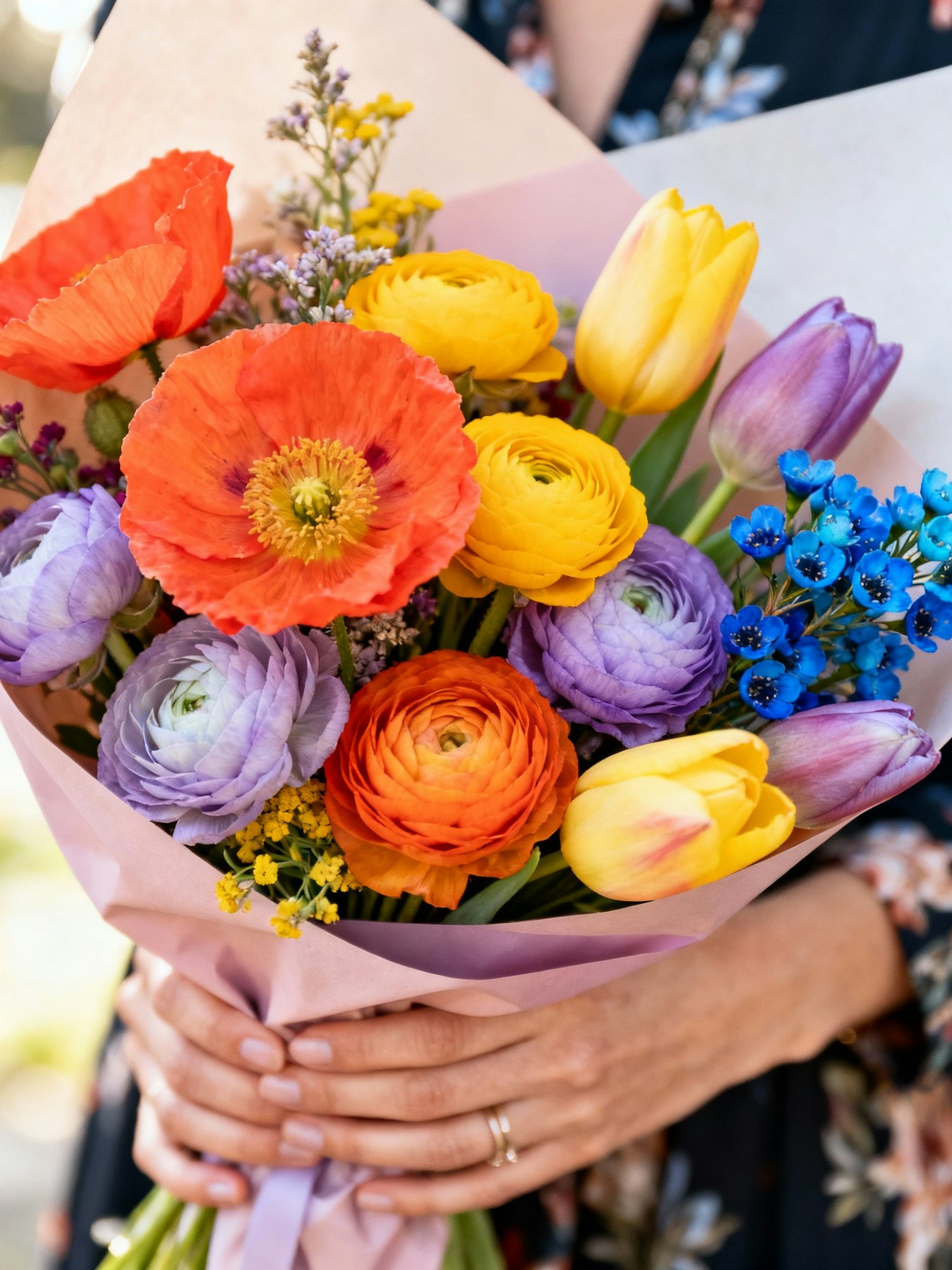 Vibrant bold aesthetic photograph, natural lifestyle style, soft daylight, candid framing, rich textures, colorful flower bouquet, not staged, influencer style photography, high quality realistic details — Close-up of hands holding a vibrant bouquet with poppies, ranunculus, tulips and wildflowers in bold tones of coral, honey yellow, lavender mist and ocean sapphire, wrapping in pastel paper, cropped shot focused on flowers with blurred outfit background, aesthetic bold look