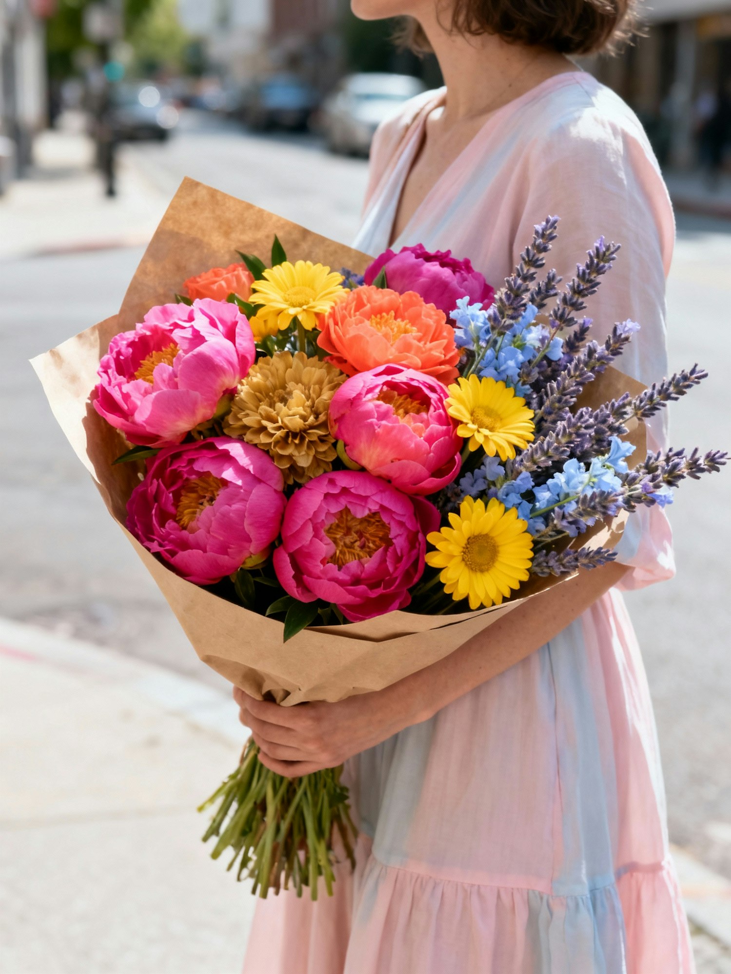 Vibrant bold aesthetic photograph, natural lifestyle style, soft daylight, candid framing, rich textures, colorful flower bouquet, not staged, influencer style photography, high quality realistic details — A person in a light pastel dress holding a bouquet wrapped in kraft paper, bouquet filled with fuchsia peonies, yellow daisies and lavender sprigs, bold mix of colors coral, honey and periwinkle, casual urban street background, candid lifestyle vibe