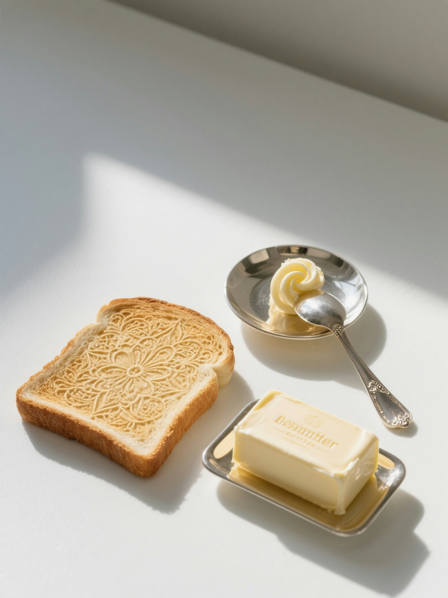 A bar of butter, a slice of toast, and a curl on a spoon — all engraved with luxe branding. Gallery-style arrangement with a minimalist breakfast theme.