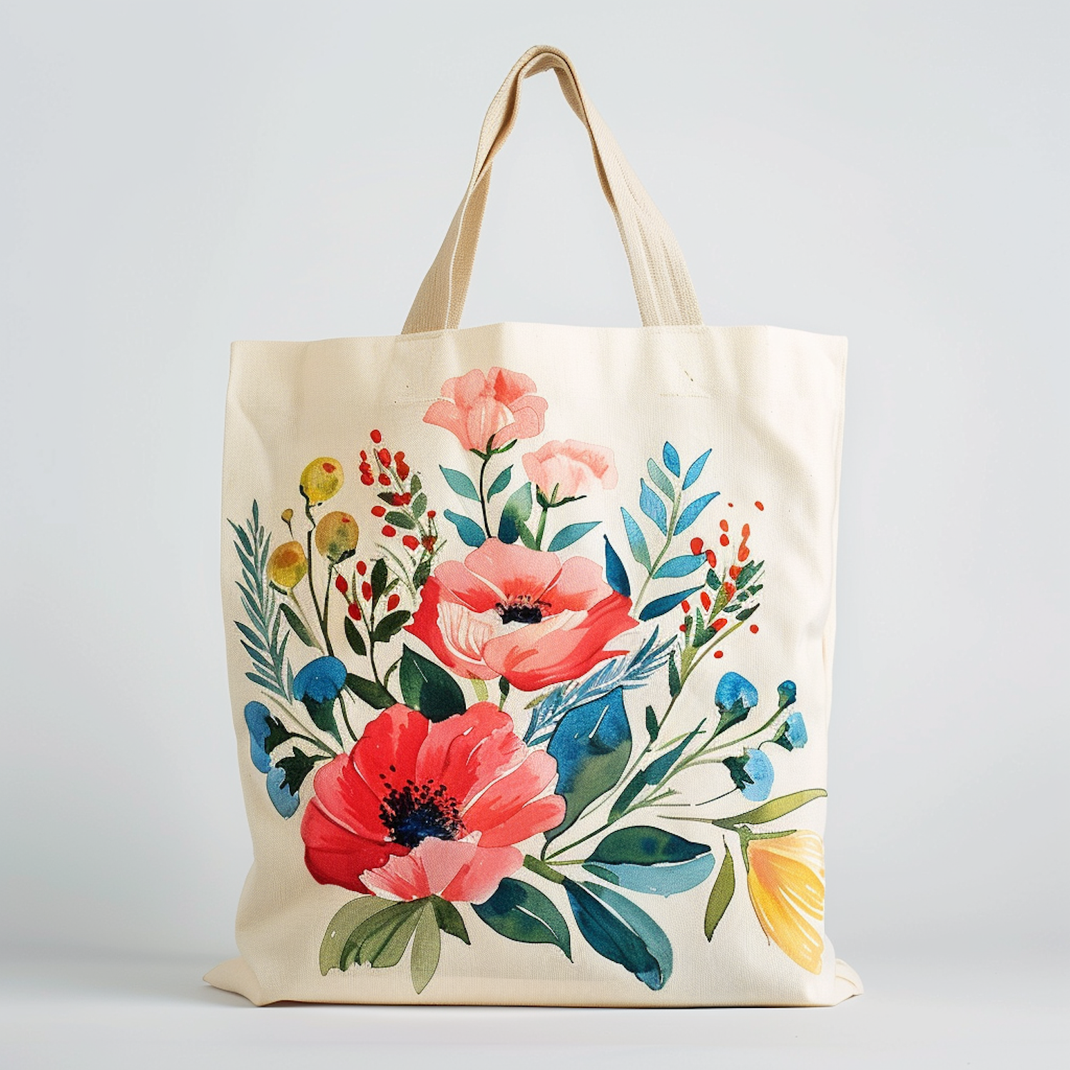 Canvas tote bag with vibrant floral design featuring red, pink, yellow, and blue flowers on a cream background. Perfect for casual outings.