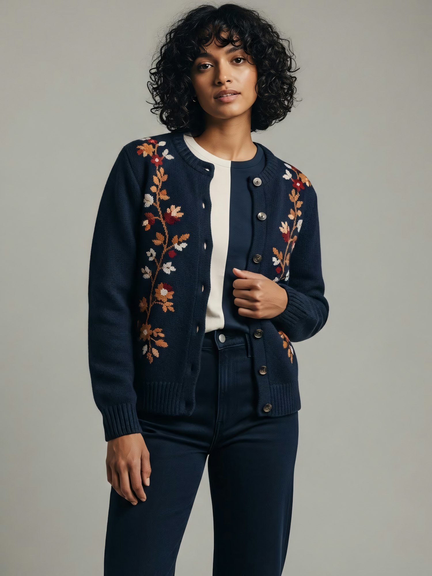 A stylish individual wearing a navy cardigan with floral embroidery, paired with dark blue pants, against a neutral background.