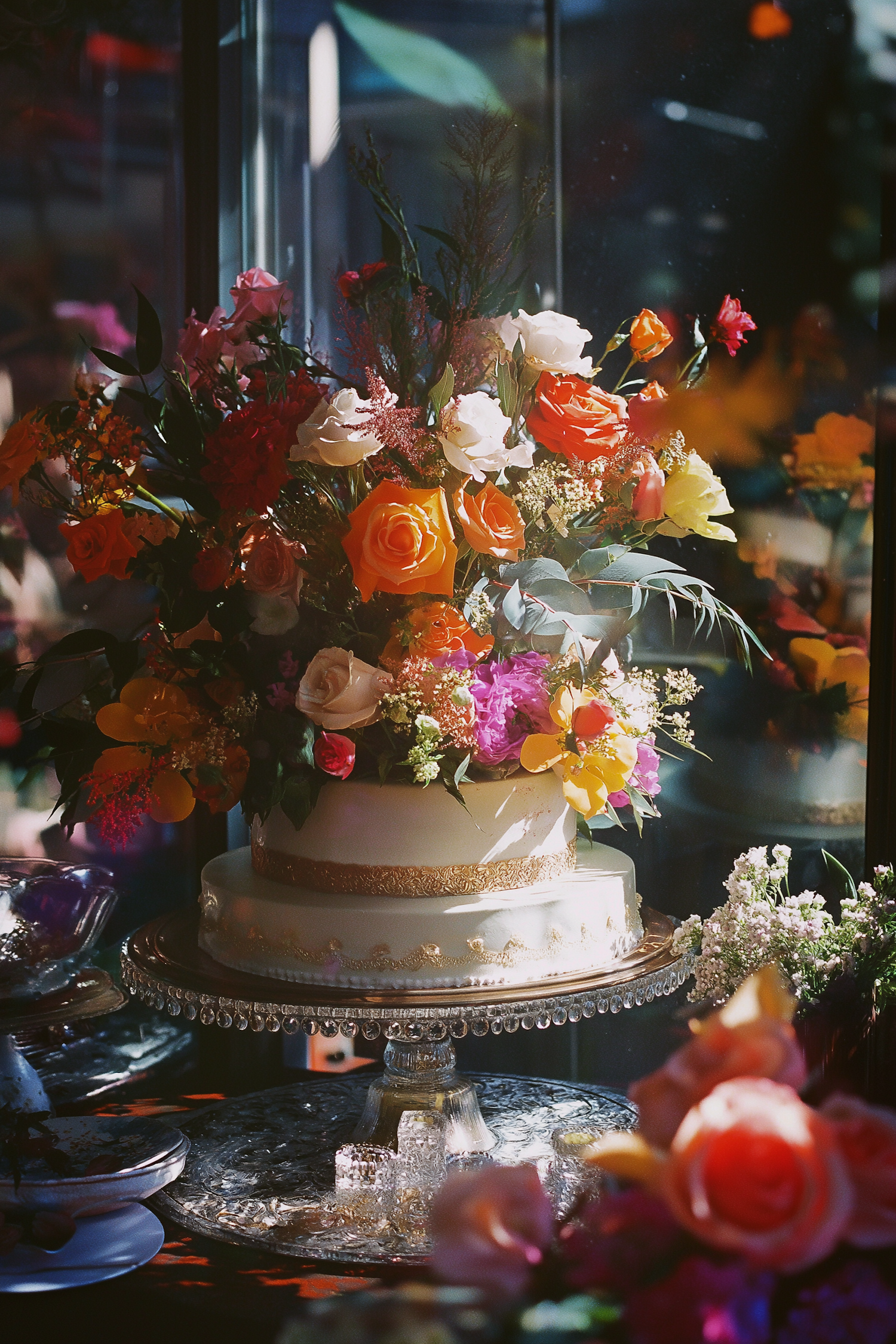 Elegant two-tiered cake with vibrant floral arrangement, featuring roses and orchids, on a glass stand in warm sunlight.