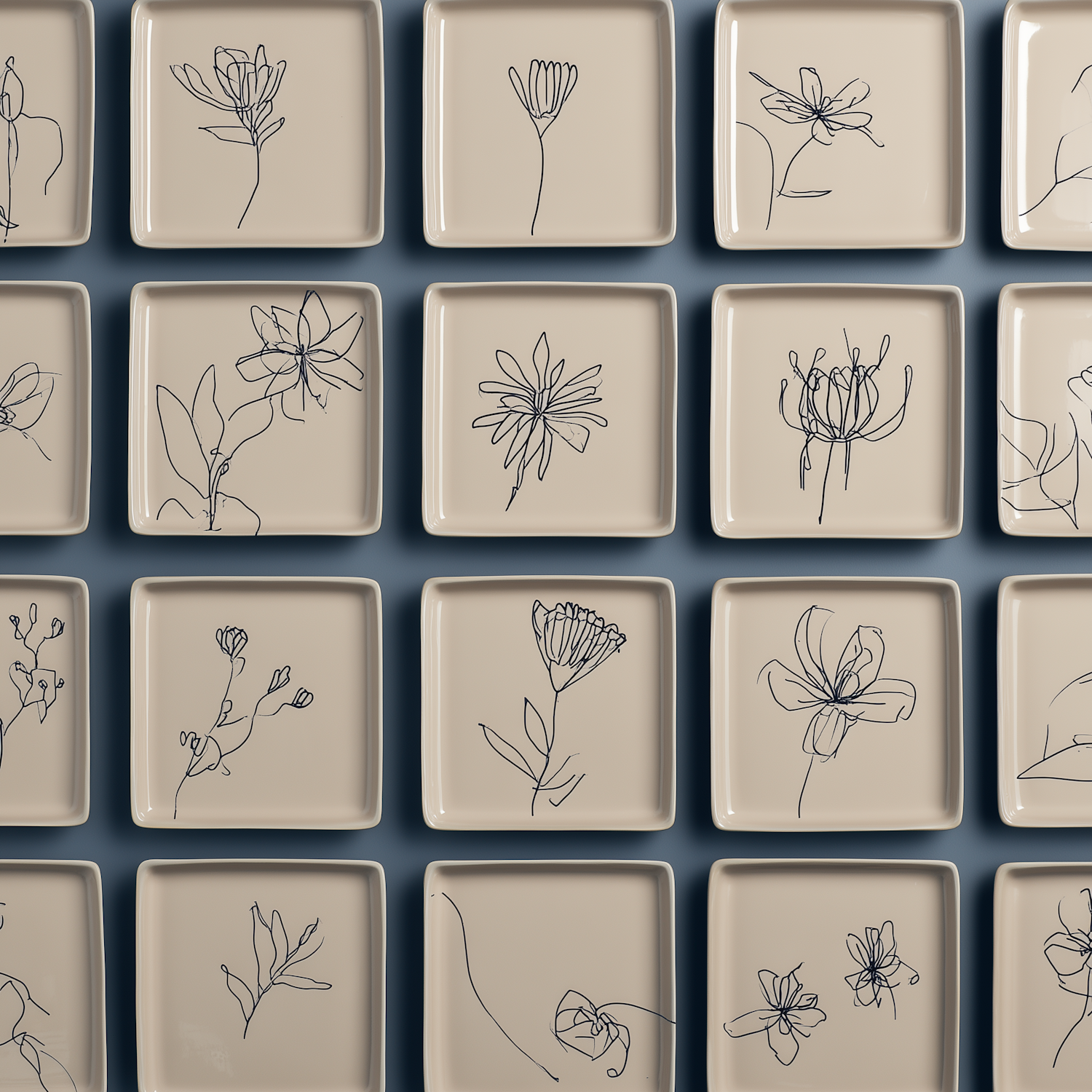 A grid of beige ceramic plates with minimalist black floral line art, set against a blue background for a modern and artistic look.