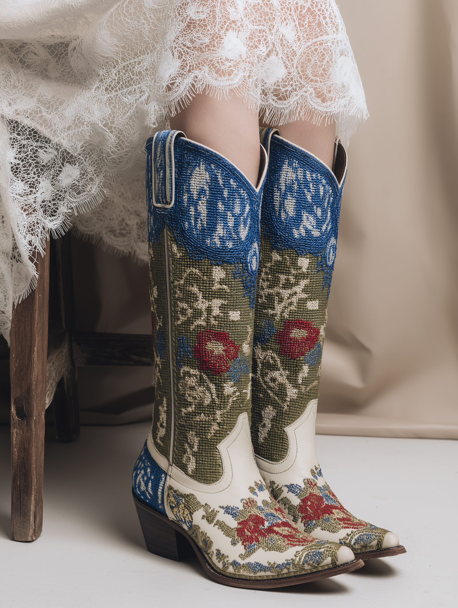 Elegant cowboy boots with floral embroidery paired with a white lace dress, blending rustic charm with sophisticated style.