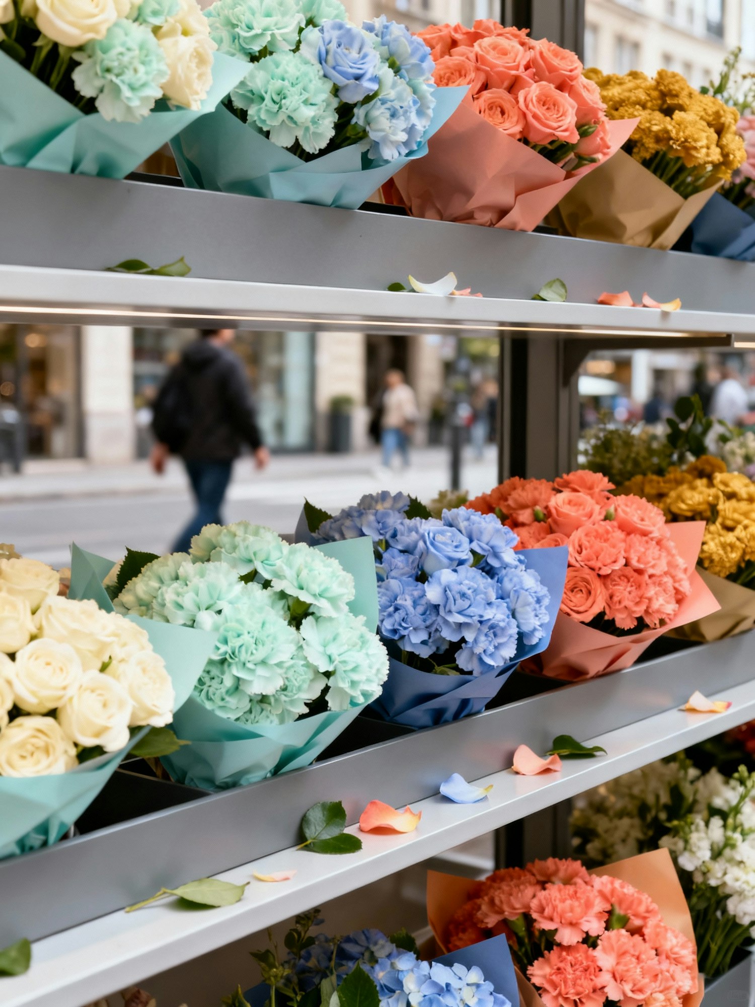 Vibrant bold aesthetic photograph, natural lifestyle style, soft daylight, candid framing, rich textures, colorful flower bouquets, not staged, influencer style photography, high quality realistic details — A modern outdoor flower display with neatly arranged bouquets in bright colors, tones of mint cream, periwinkle, coral and honey, displayed on sleek shelves with colorful wrapping, urban street vibe, lively and aesthetic mood