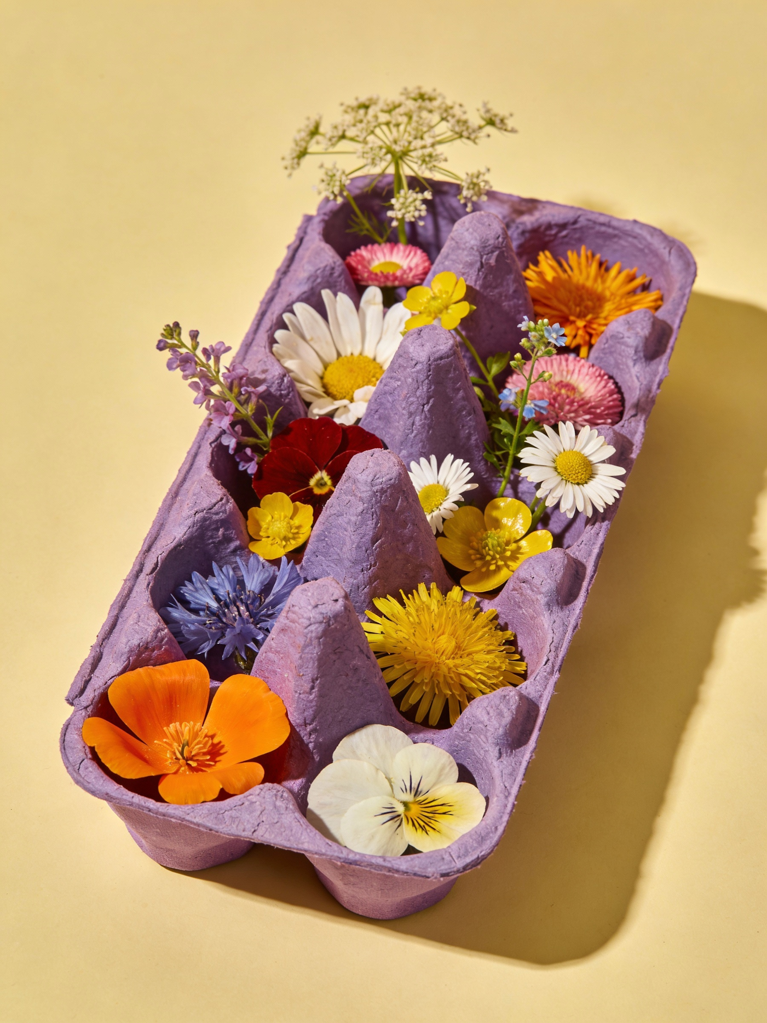 A purple egg carton topped with wildflowers, set against a plain light-yellow studio.