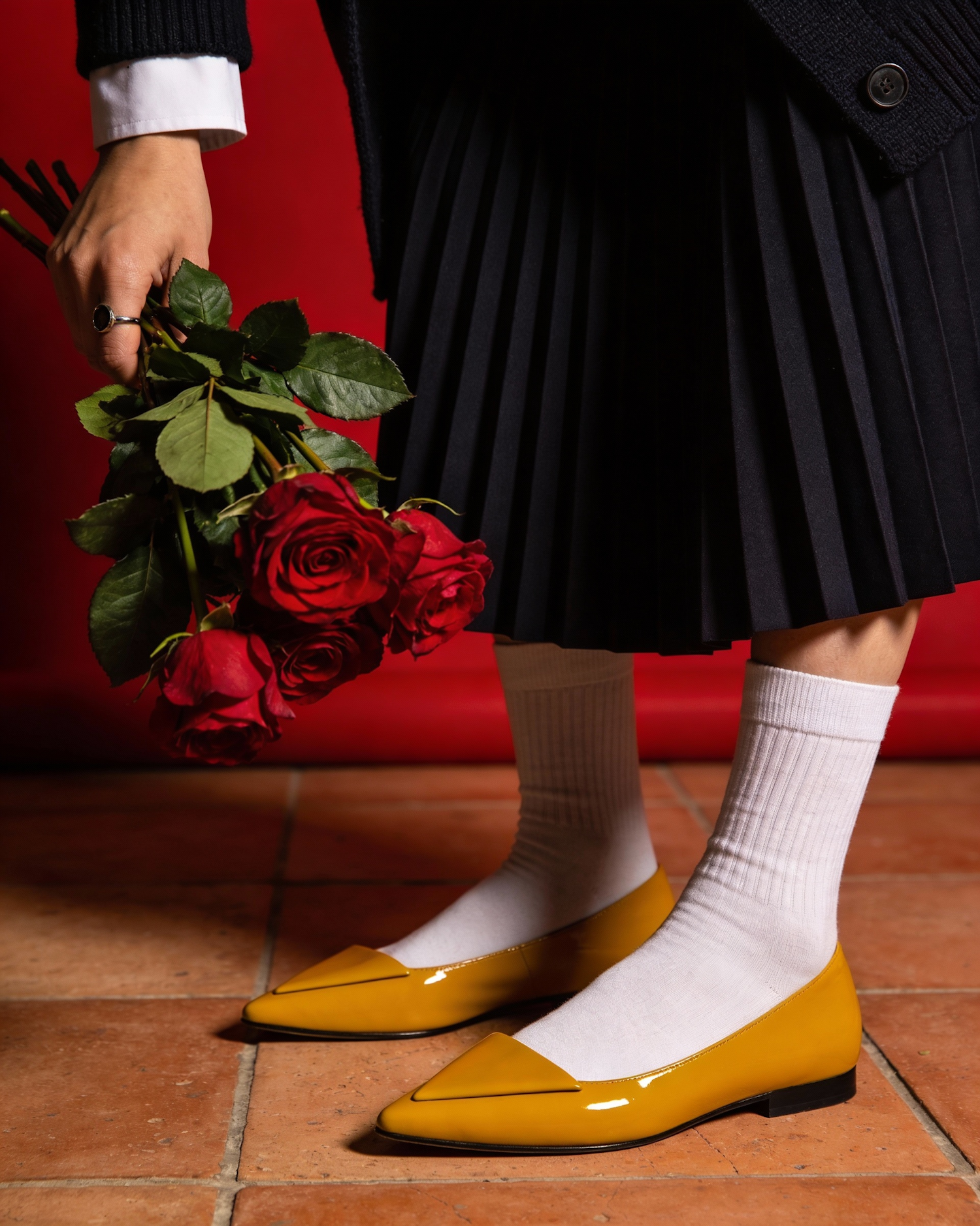 A stylish composition featuring yellow flats, white socks, and a bouquet of red roses against a bold red background.