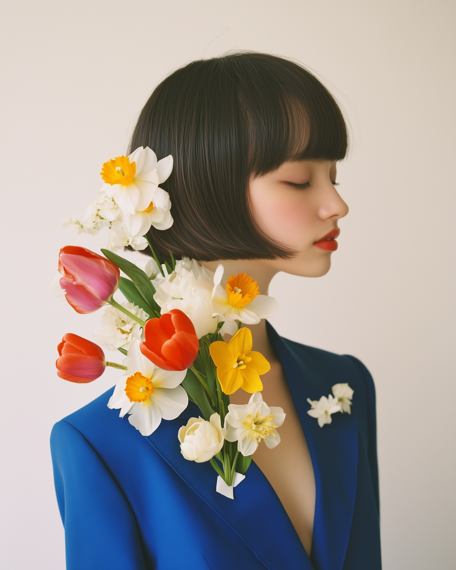 Elegant profile of a woman in a blue blazer adorned with vibrant tulips and daffodils, blending fashion and floral art.