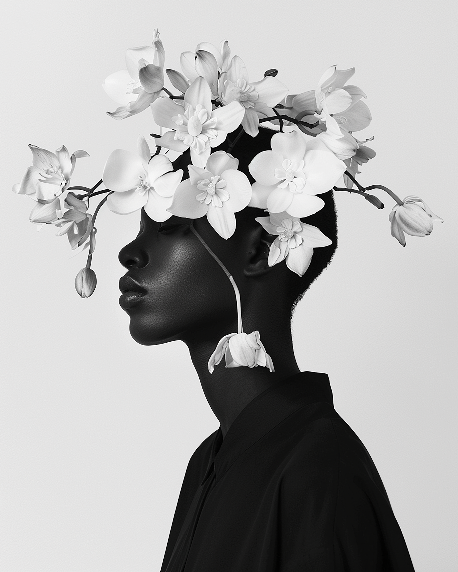 Elegant black and white portrait with floral headpiece, showcasing contrast and serenity in a minimalist composition.