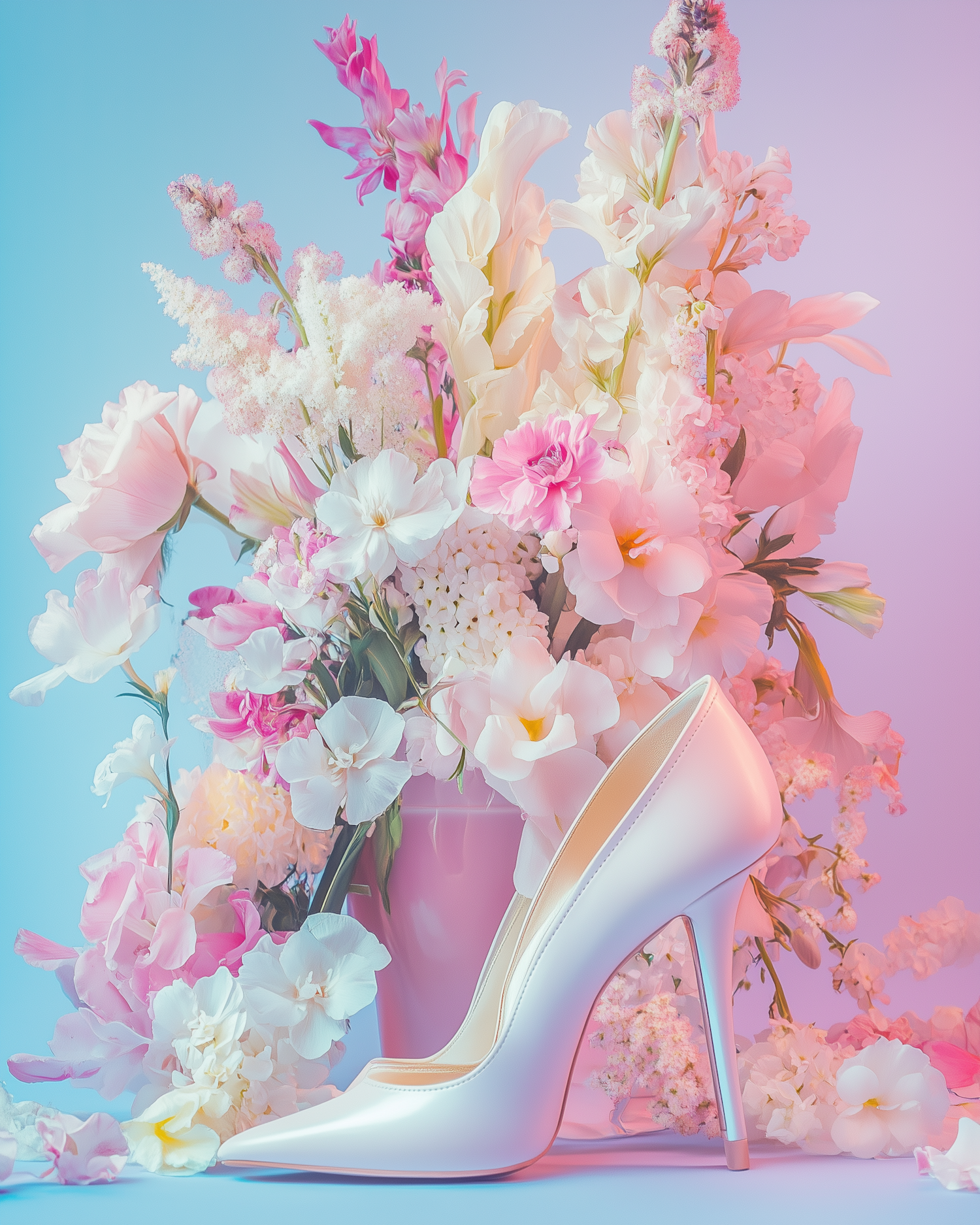 Elegant white high heel amidst lush pastel flowers on a dreamy blue-pink gradient background.